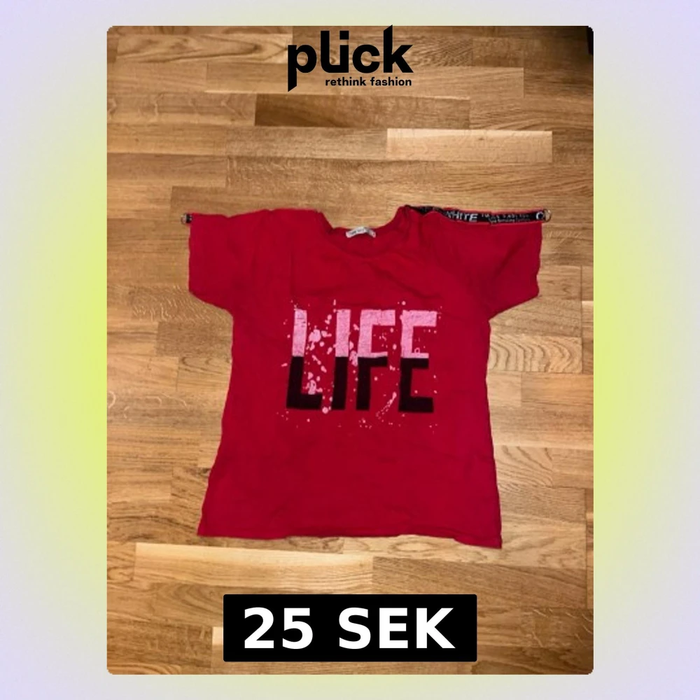 Röd t-shirt från Baby Lady i storlek L med stort LIFE-tryck i vitt och svart på framsidan. Klassisk rund hals och korta ärmar. Skön och enkel modell i mjukt bomullsmaterial, perfekt till jeans eller shorts.