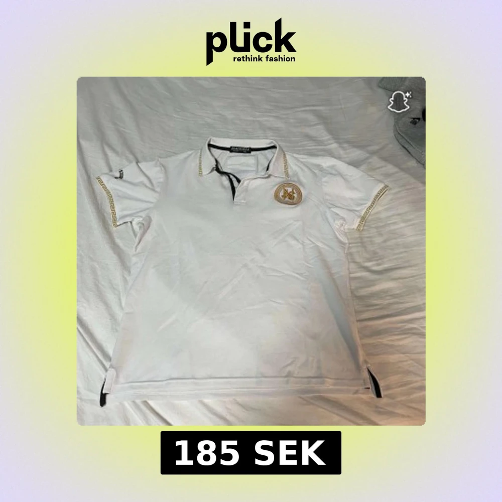 Vit polo t-shirt från Blacklisted med guldfärgade detaljer och mönster längs ärmarna och kragen. Har en broderad logga på bröstet och klassisk krage med knappslå. Perfekt för dig som gillar stilrena och exklusiva plagg.