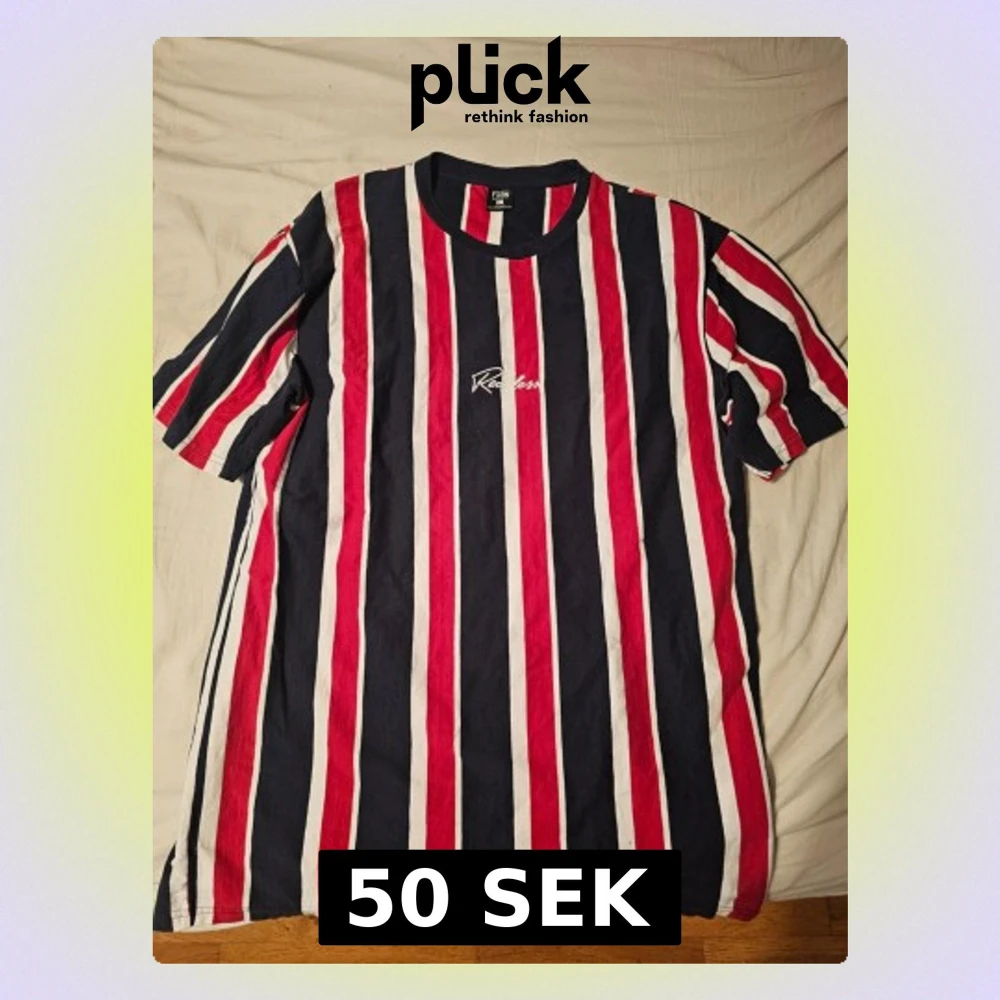 Säljer en relaxed fit t-shirt från FSBN med vertikala ränder i marinblått, rött och vitt. T-shirten har korta ärmar, rund halsringning och ett broderat FSBN-tryck på bröstet. Tillverkad i mjuk bomull, perfekt för en chill och stilren look.