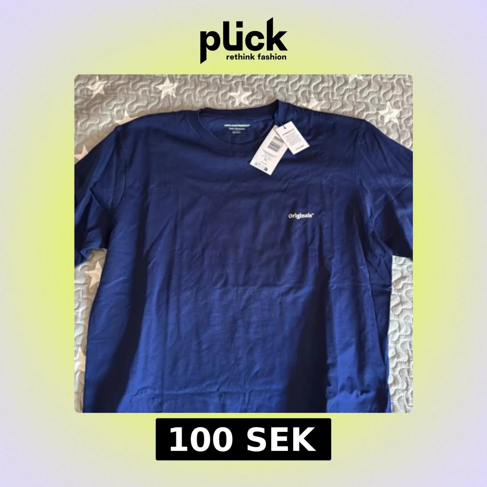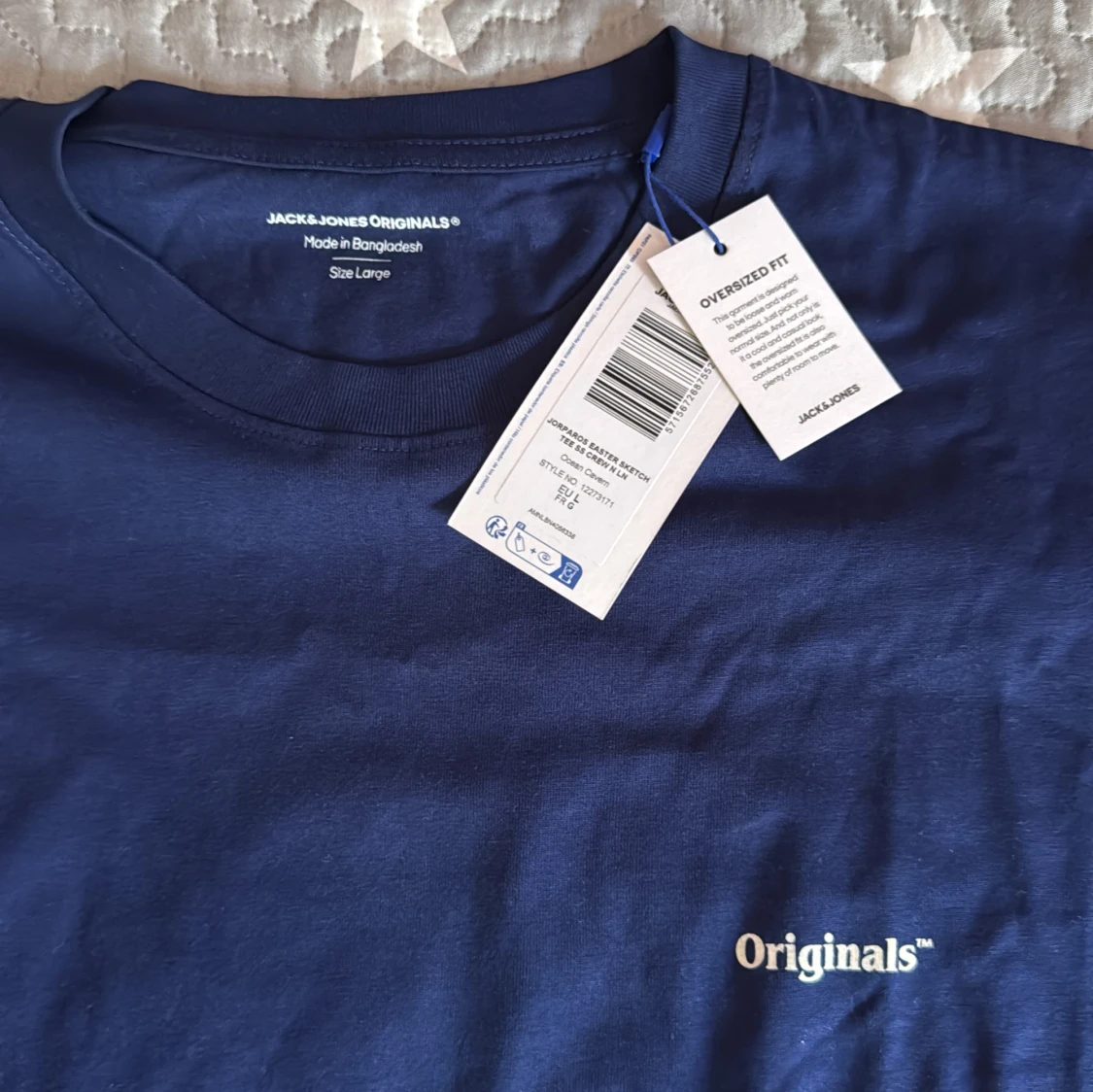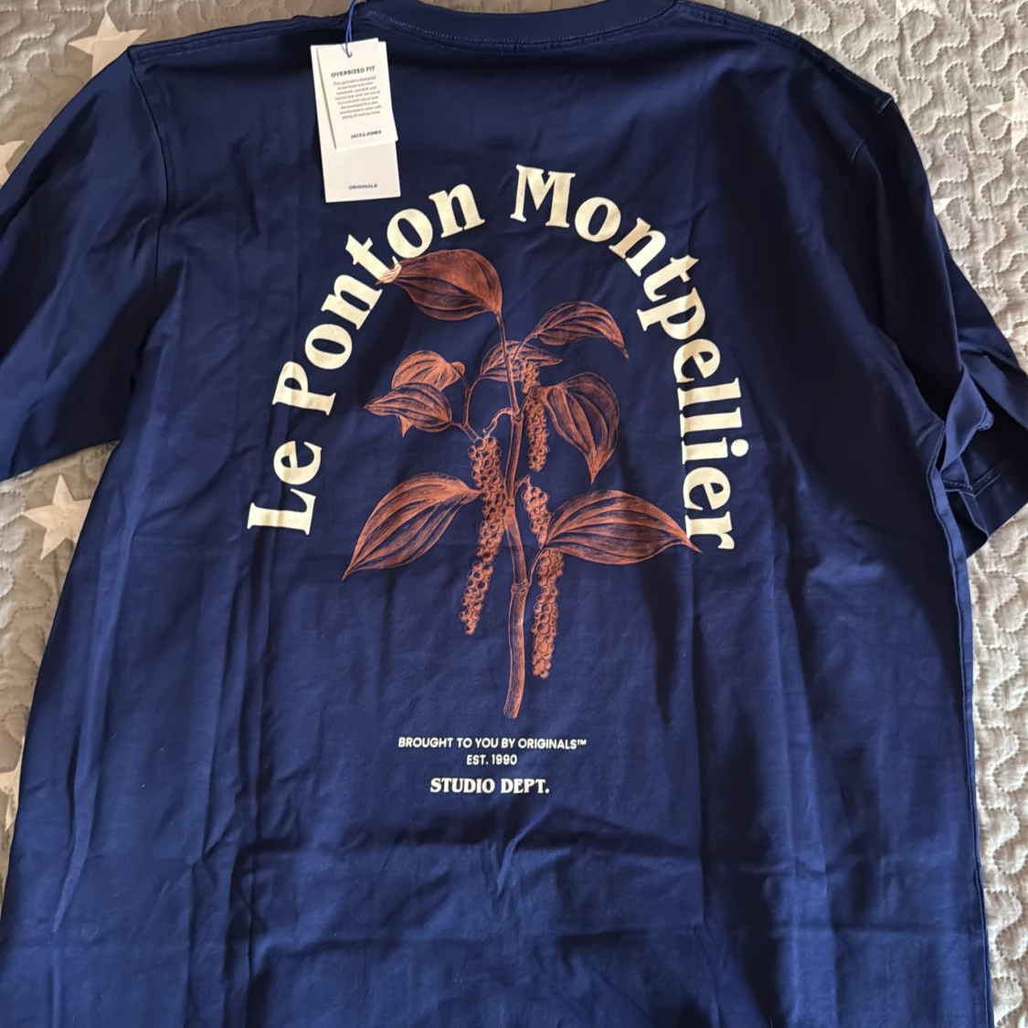 Snygg oversized t-shirt från Jack & Jones Originals i marinblå färg. Framsidan har en liten vit Originals-logga och baksidan har ett stort tryck med texten 'Le Ponton Montpellier' och en brun botanisk illustration. Mjuk bomullskvalitet och klassisk rund hals.