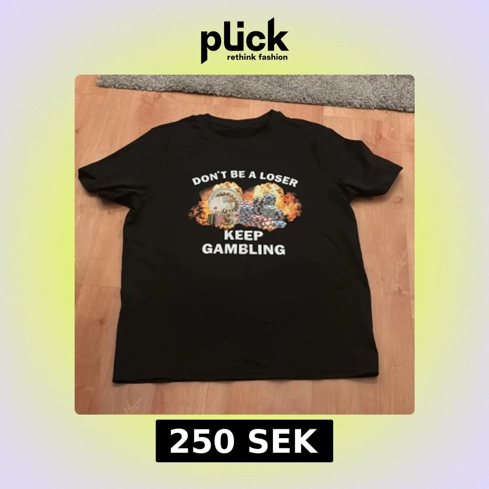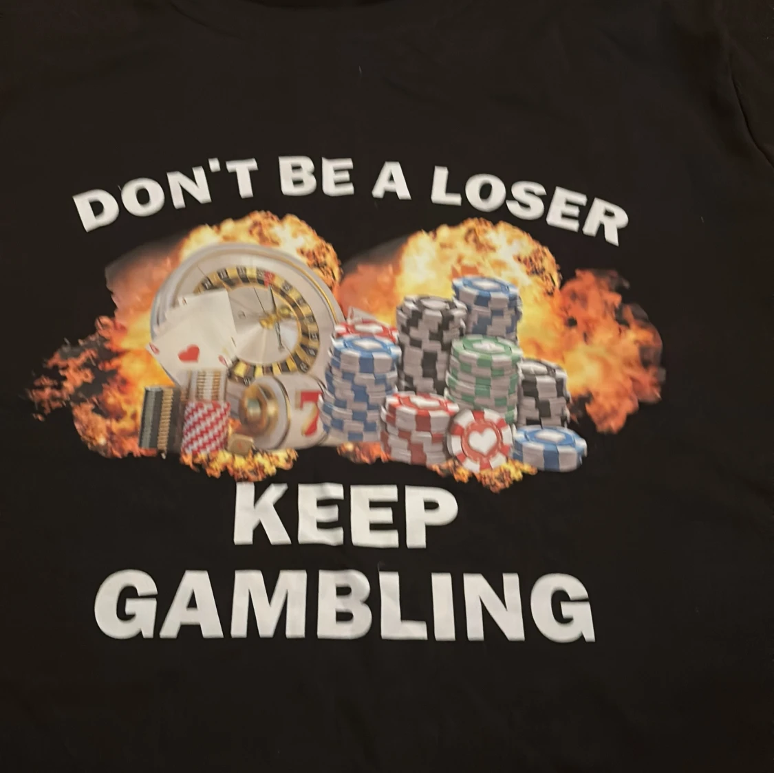 Svart t-shirt med stort färgglatt tryck framtill som visar pokerchips, spelkort, roulette och eld. Texten 'DON'T BE A LOSER KEEP GAMBLING' i vitt. Klassisk passform och rund hals. Perfekt för dig som gillar unika och roliga statement-plagg.