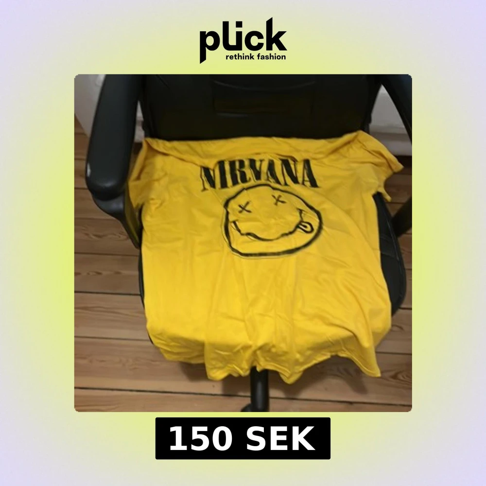 Säljer en gul t-shirt med Nirvana-tryck och det ikoniska smiley-ansiktet på framsidan. T-shirten är kortärmad och perfekt för fans av bandet. Storlek L.