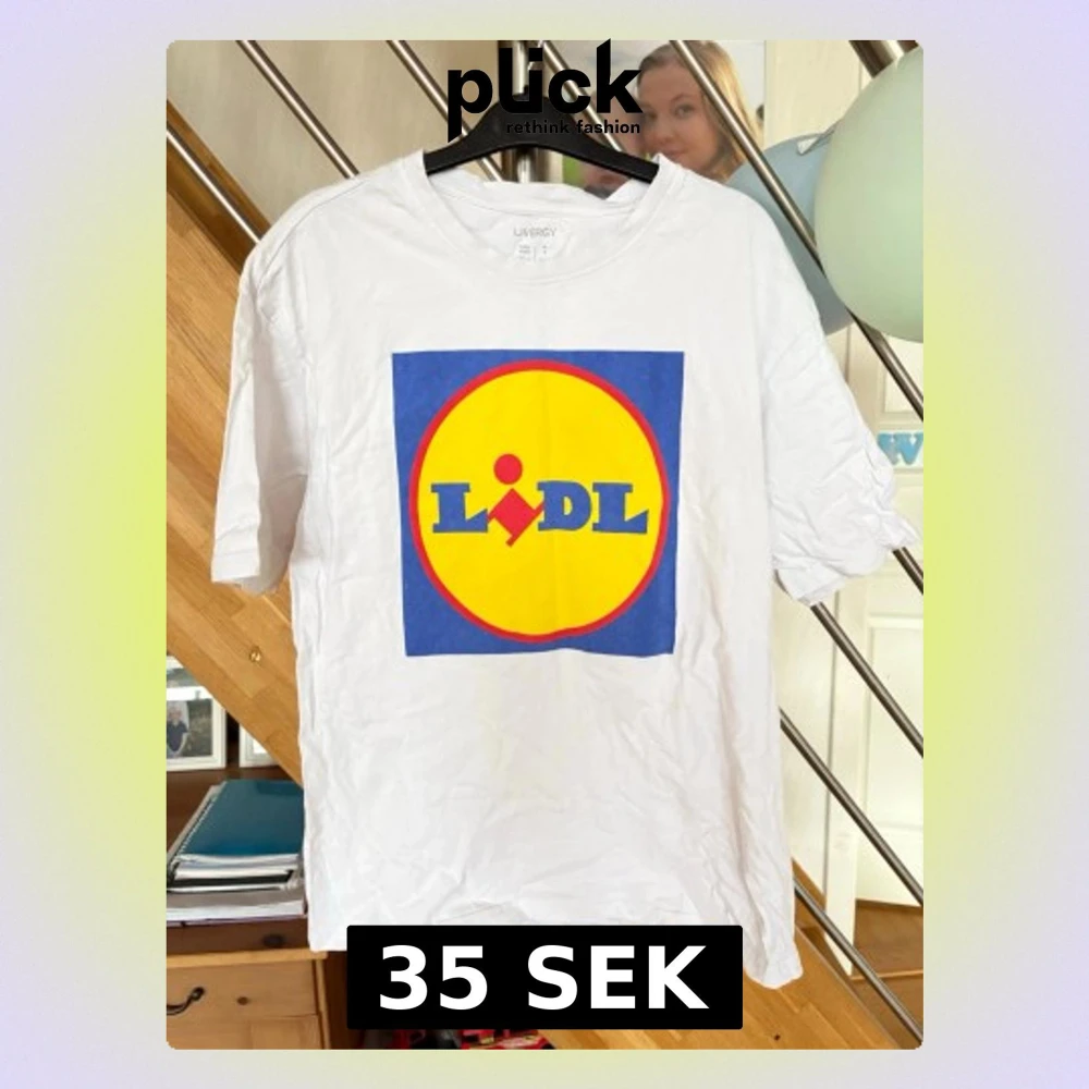 Vit t-shirt från Livergy med stort Lidl-tryck på bröstet i blått, gult och rött. Klassisk rund hals och korta ärmar. Perfekt för dig som gillar att sticka ut med humor och enkel stil. Gjord i mjuk bomull som känns skön mot huden.