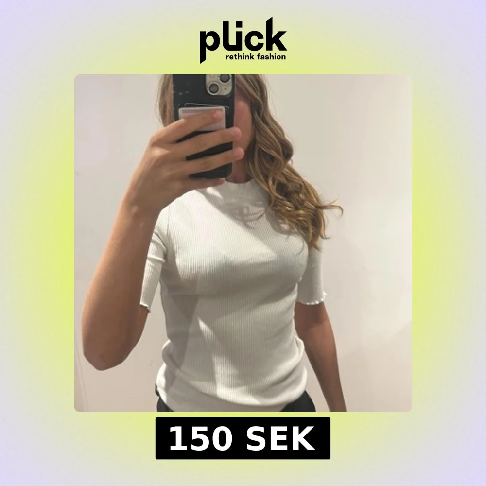 Säljer en vit ribbad topp från Selected Femme. Toppen har korta ärmar, hög hals och är figurnära i modellen. Perfekt att styla till olika outfits och passar året runt.