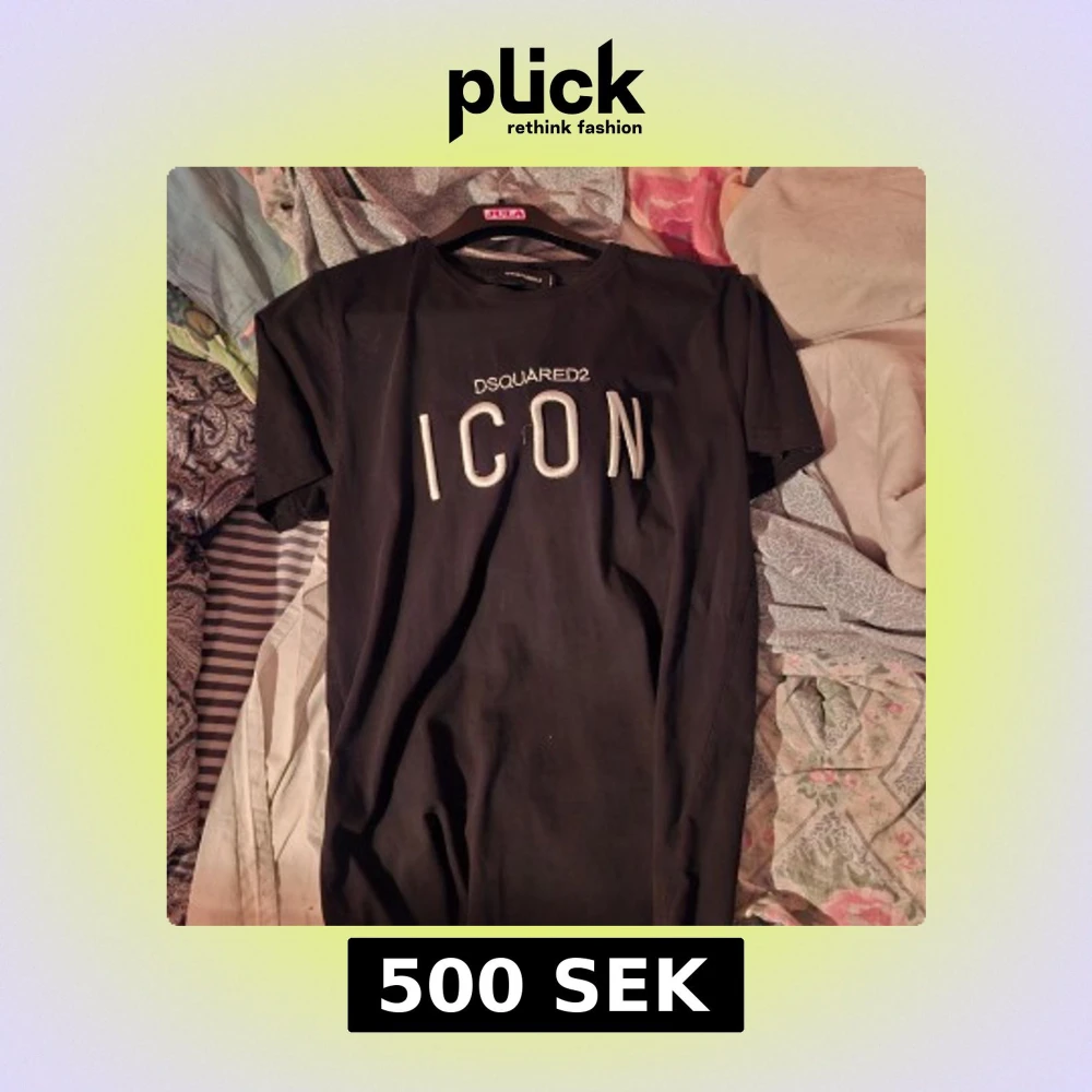 Säljer en svart t-shirt från Dsquared2 med texten 'ICON' i vitt på framsidan. T-shirten har en klassisk rund hals och korta ärmar. Perfekt för en stilren look. Passar s-m