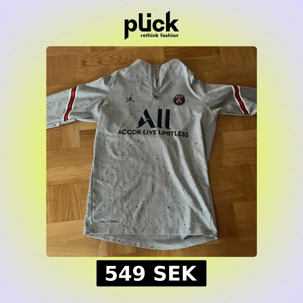 Snygg PSG träningströja från Jordan i ljusgrått med svarta stänk, klubbmärke på bröstet och dragkedja vid halsen. Röda och svarta detaljer på ärmarna. Tillverkad i funktionsmaterial, perfekt för fotbollsträning eller streetwear.