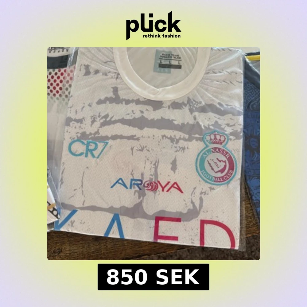 Säljer en vit Al Nassr fotbollströja med CR7-tryck och Ronaldo 7 på ryggen. Tröjan är köpt utomlands men kvaliten och materialet är 10/10. Helt oanvänd !