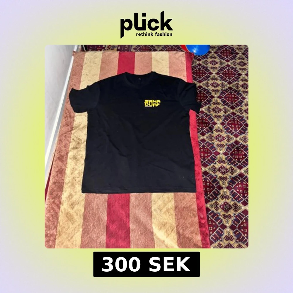 Svart t-shirt med coolt och färgglatt tryck på ryggen med svamp, öga och texten Sana Duri. Liten gul logga på bröstet. Perfekt för dig som gillar unika och kreativa plagg.