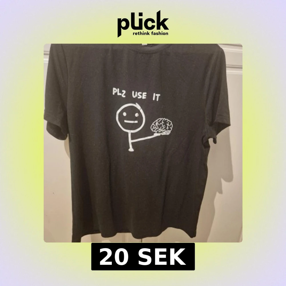 Svart t-shirt med ett vitt meme-tryck framtill som föreställer en streckgubbe som håller en hjärna och texten 'PLZ USE IT'. Klassisk rund hals och korta ärmar. Perfekt för dig som gillar humor och vill sticka ut.
