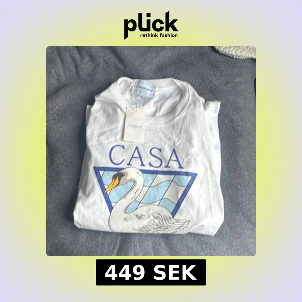Snygg vit t-shirt från Casablanca med stort tryck av en svan och blått grafiskt mönster på framsidan. T-shirten har klassisk passform, rund hals och korta ärmar. Perfekt för dig som gillar stilrena men ändå unika prints.