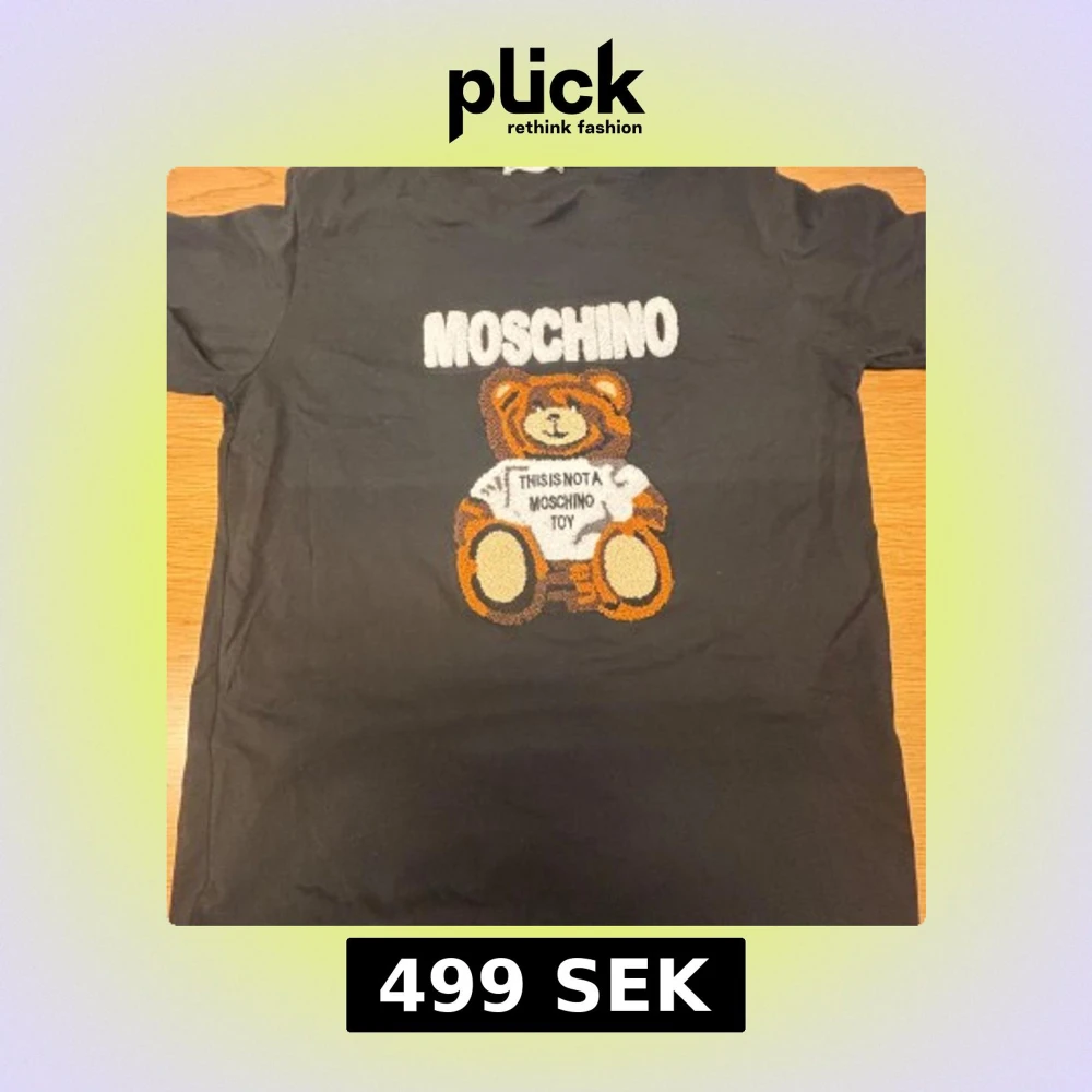 Snygg svart t-shirt från Moschino med ett stort nalletryck och texten 'This is not a Moschino toy'. Storlek large kontakta vid minsta intresse