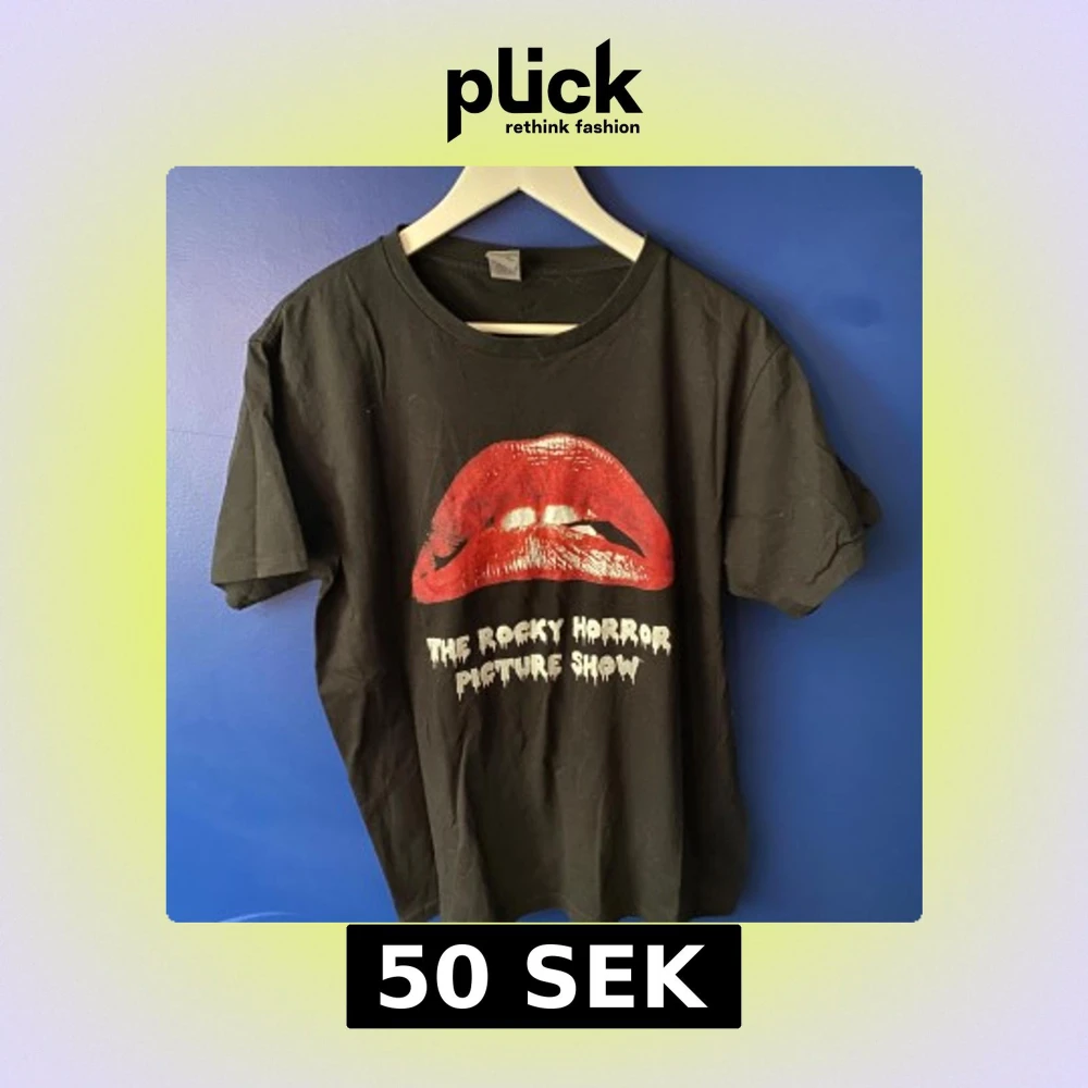 Svart t-shirt från Gildan med tryck av röda läppar och texten 'The Rocky Horror Picture Show' på framsidan. Klassisk passform, rund hals och korta ärmar. Tillverkad i 100% bomull, perfekt för dig som gillar kultfilm och vill sticka ut.