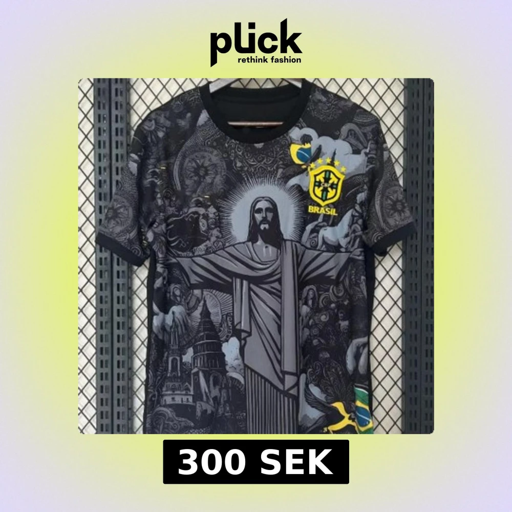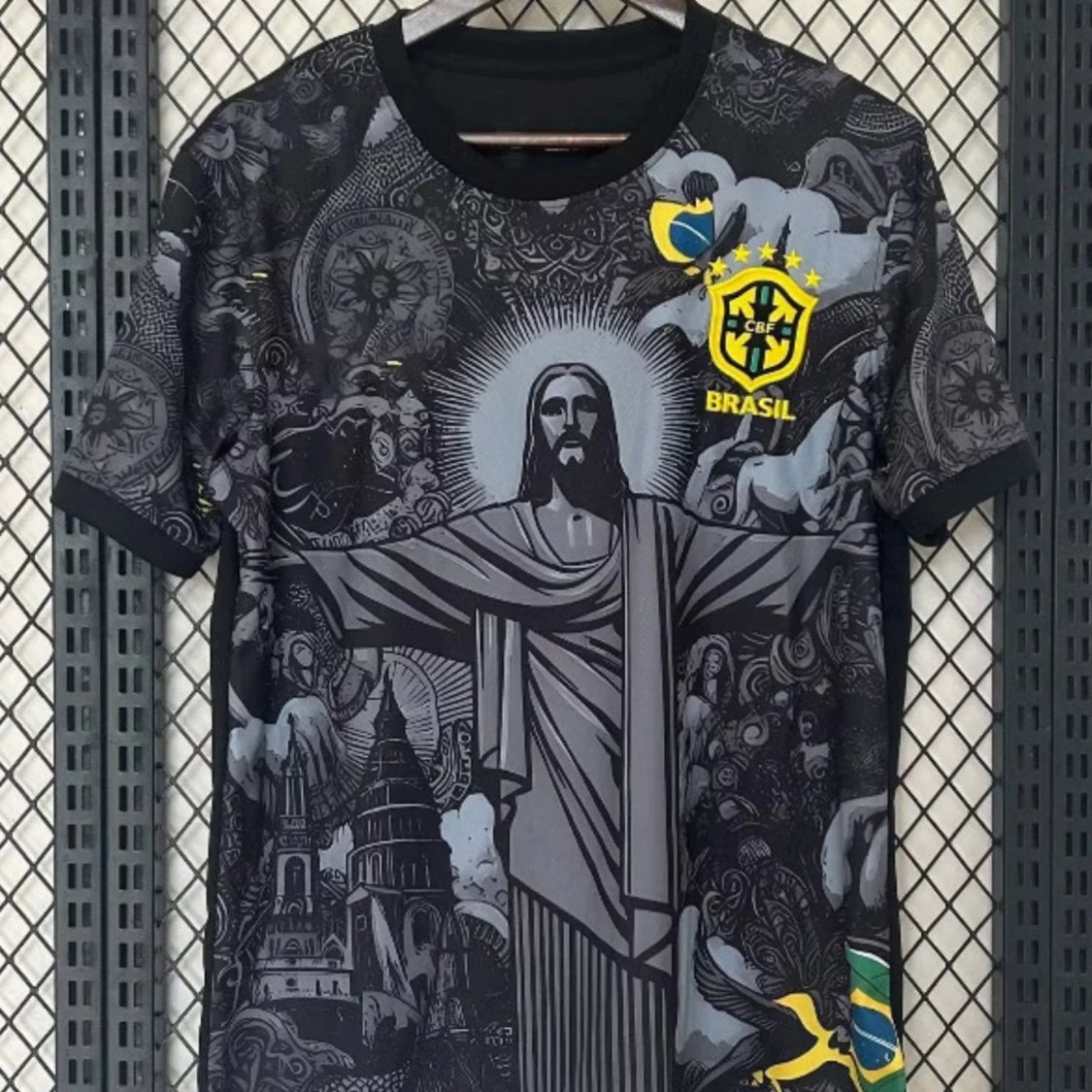 Unik svart fotbollströja med Brasilien-emblem och stort tryck av Kristusstatyn på framsidan. Tröjan har korta ärmar, detaljer i gult och grönt samt mönster med brasilianska motiv. Perfekt för dig som vill sticka ut på matchen.