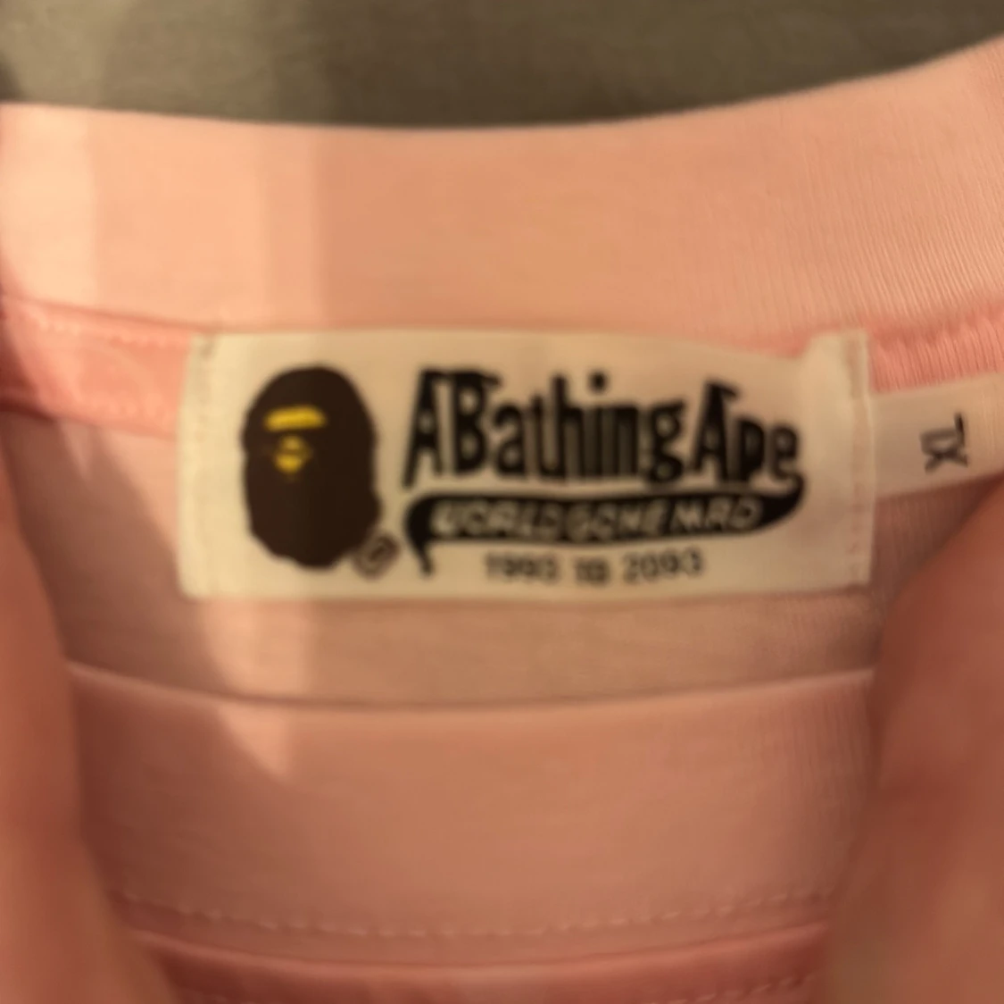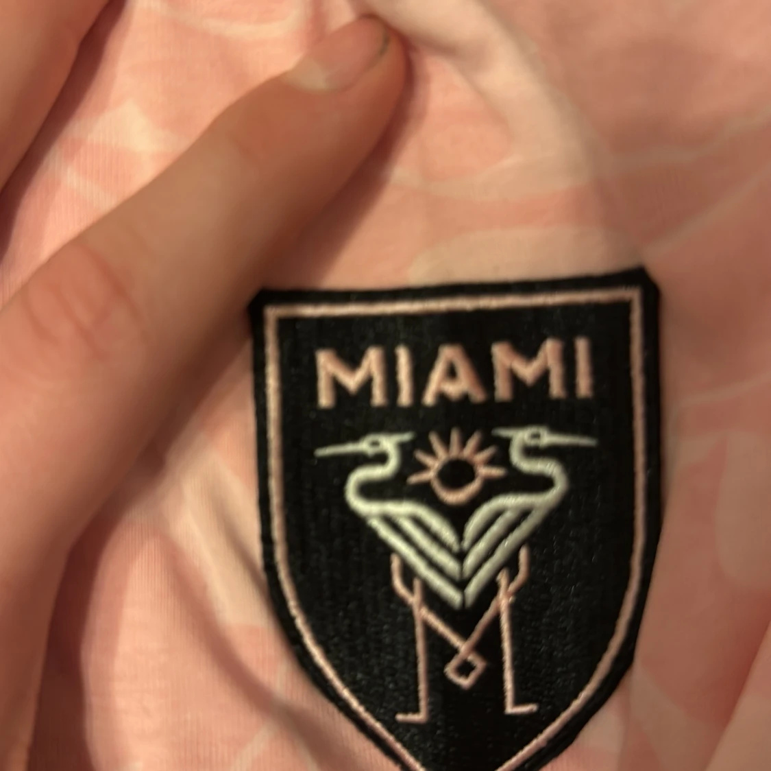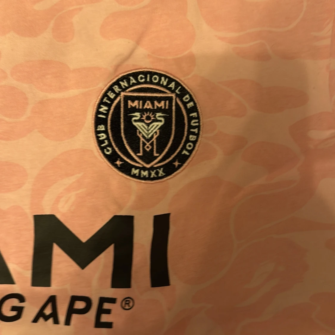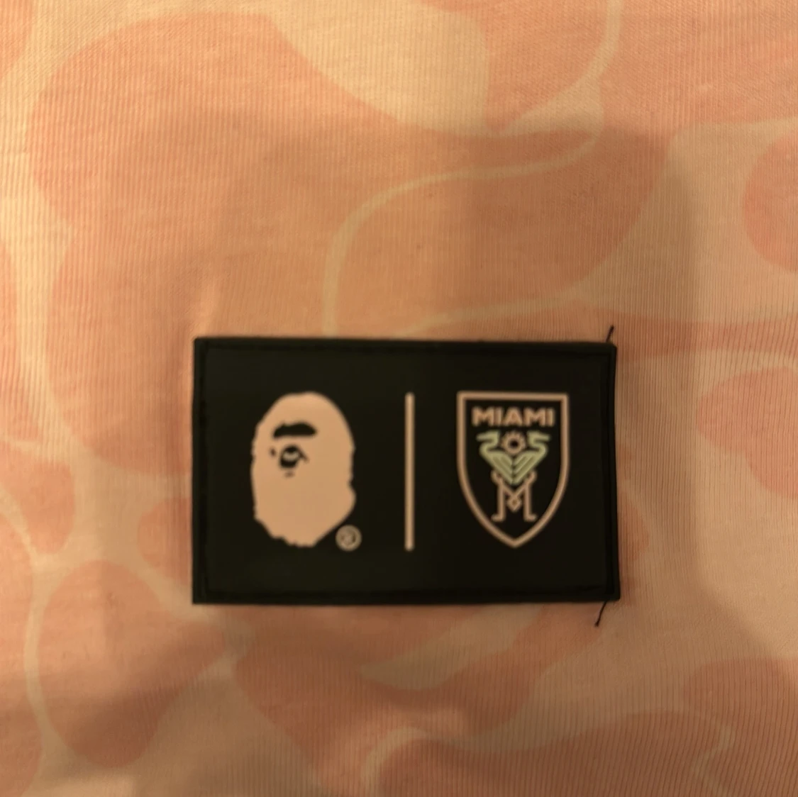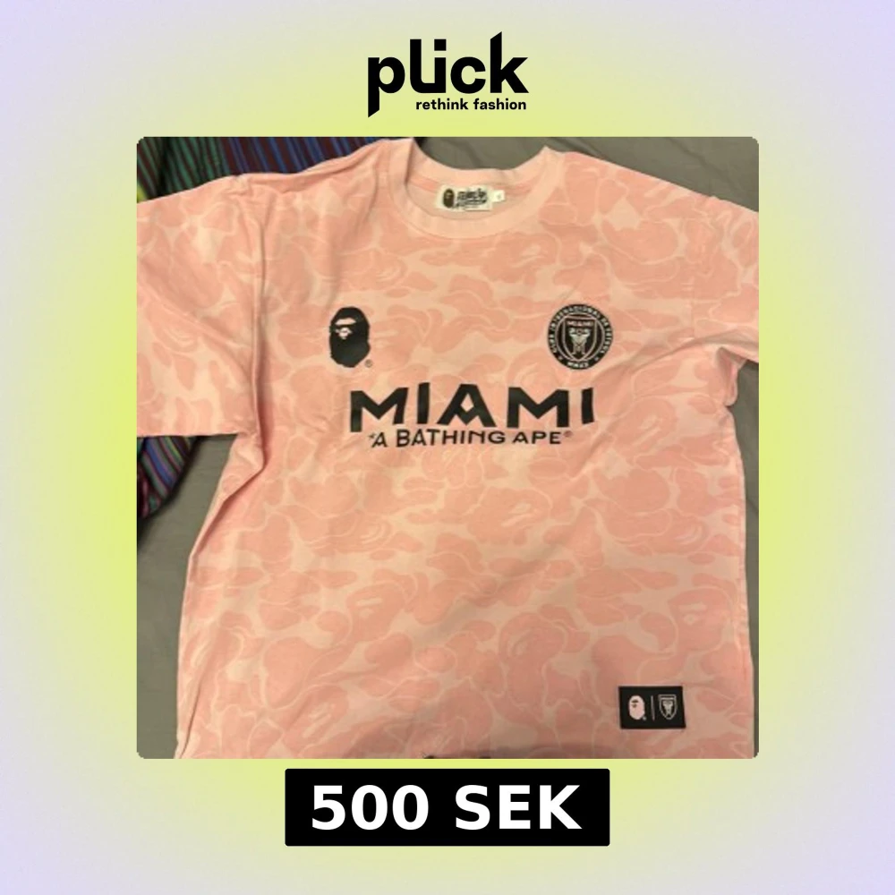 Säljer en rosa fotbollströja från A Bathing Ape i samarbete med Miami. Tröjan har ett unikt mönster och tryck med Miami och A Bathing Ape-loggor. Perfekt för dig som gillar streetwear och fotboll.