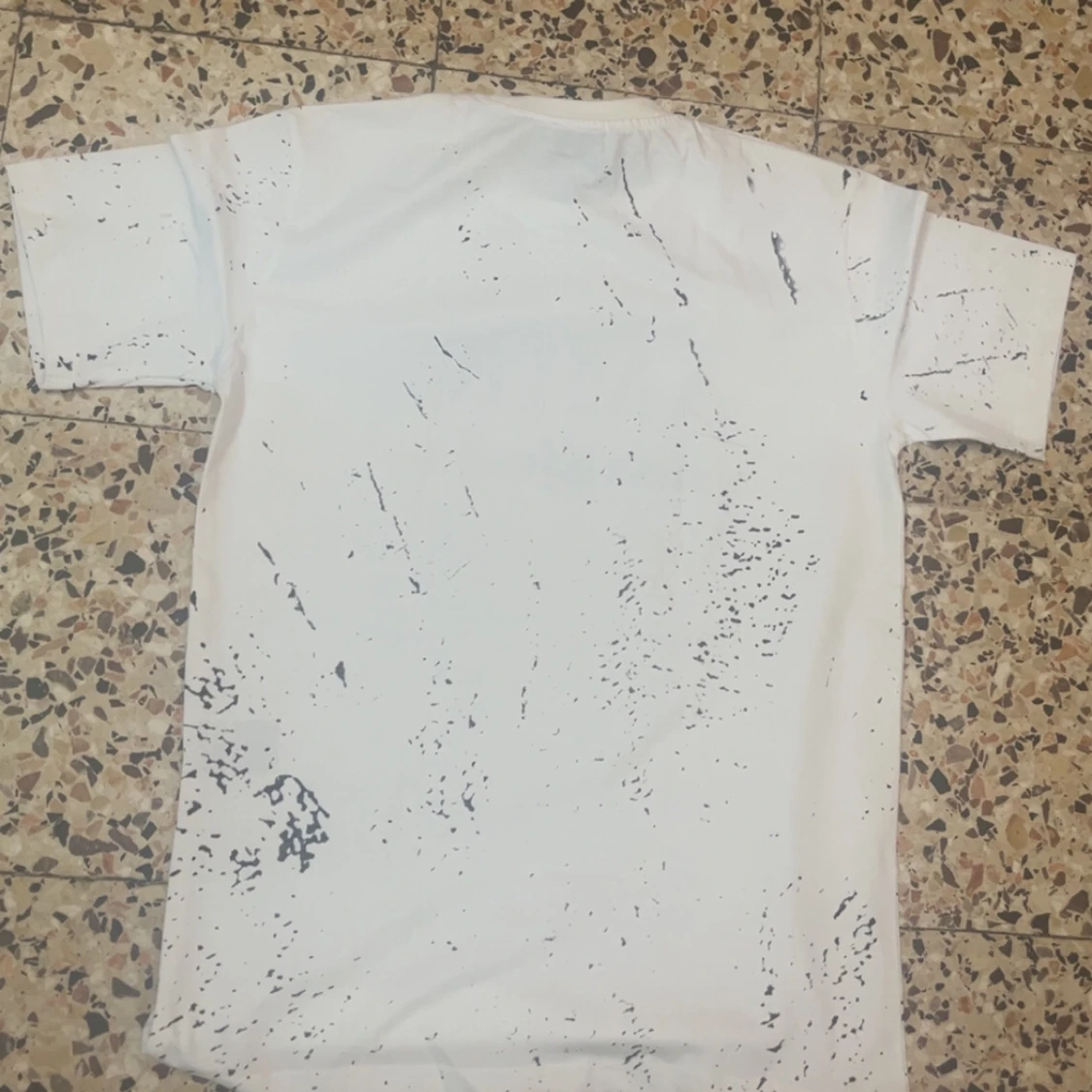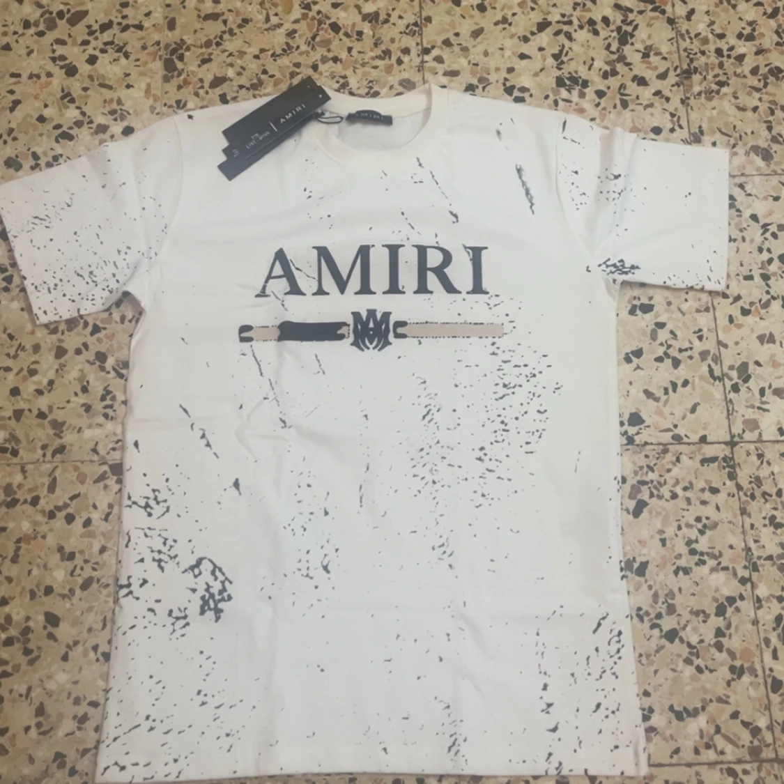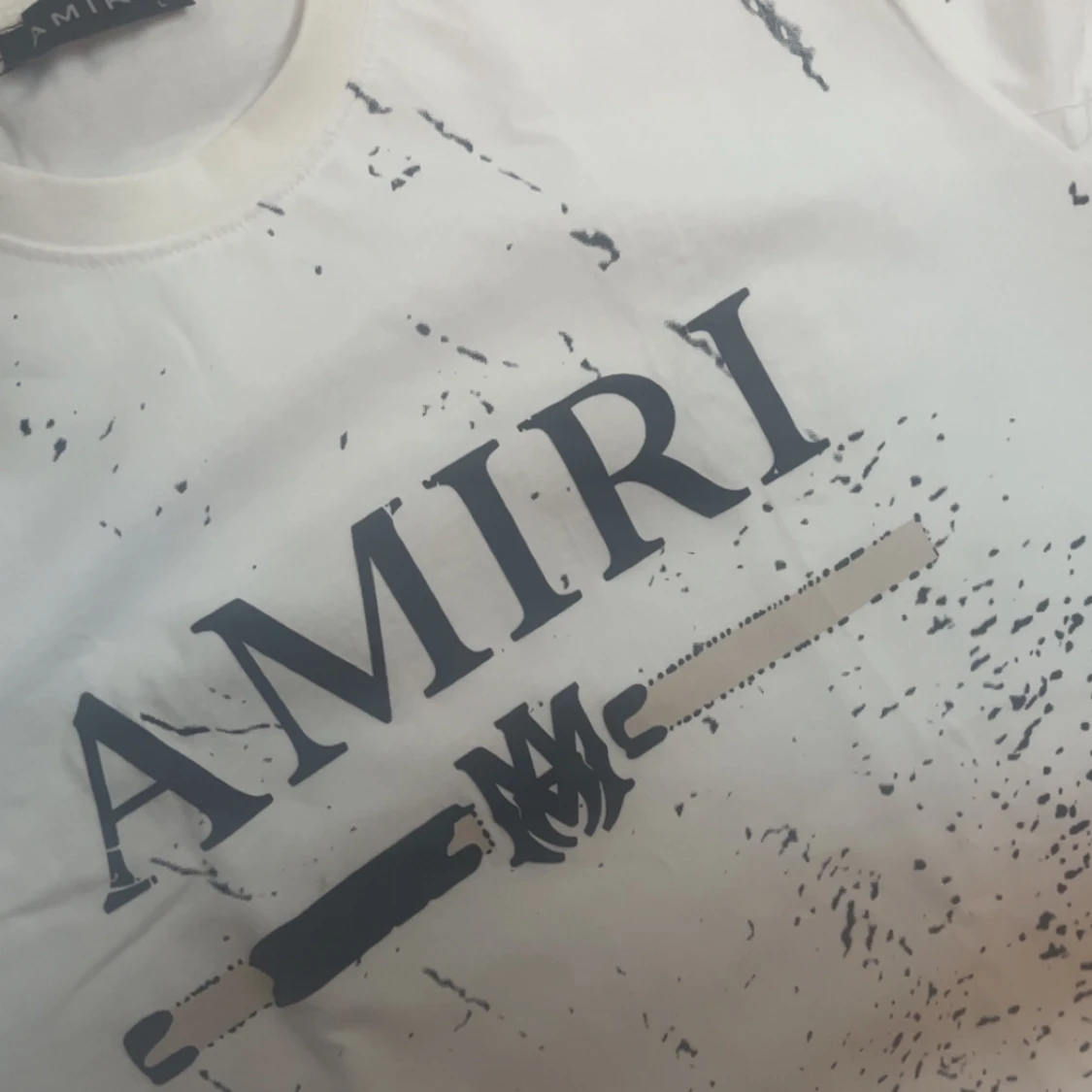 Snygg vit t-shirt från AMIRI i bomull med svart logotyptryck framtill och coolt stänkmönster över hela tröjan. Klassisk passform med rund hals och korta ärmar. Perfekt för dig som vill sticka ut med en streetinspirerad look.