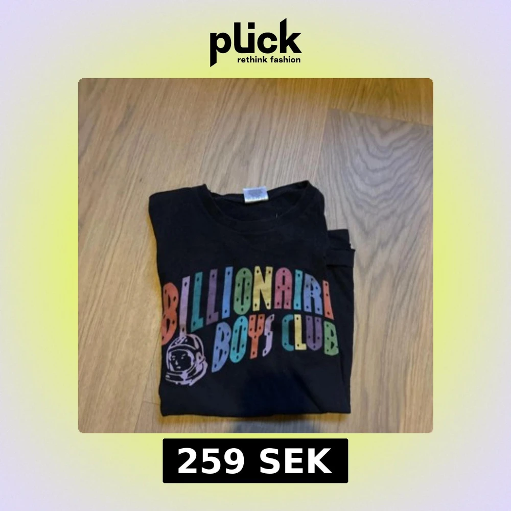 Säljer en svart t-shirt från Billionaire Boys Club med färgglatt tryck på bröstet och astronaut-logga. T-shirten är i 100% bomull och har en klassisk passform med korta ärmar. Perfekt för dig som gillar streetwear och vill sticka ut med en ikonisk design.