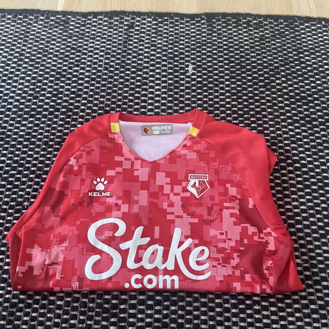 Säljer en officiell Watford fotbollströja från Kelme i rött med digitalt camo-mönster på framsidan. Tröjan har korta ärmar, V-ringning och klubbmärke på bröstet. Materialet är lätt och andas, perfekt för träning eller match. Sponsorlogga på magen. Pris går att diskutera.
