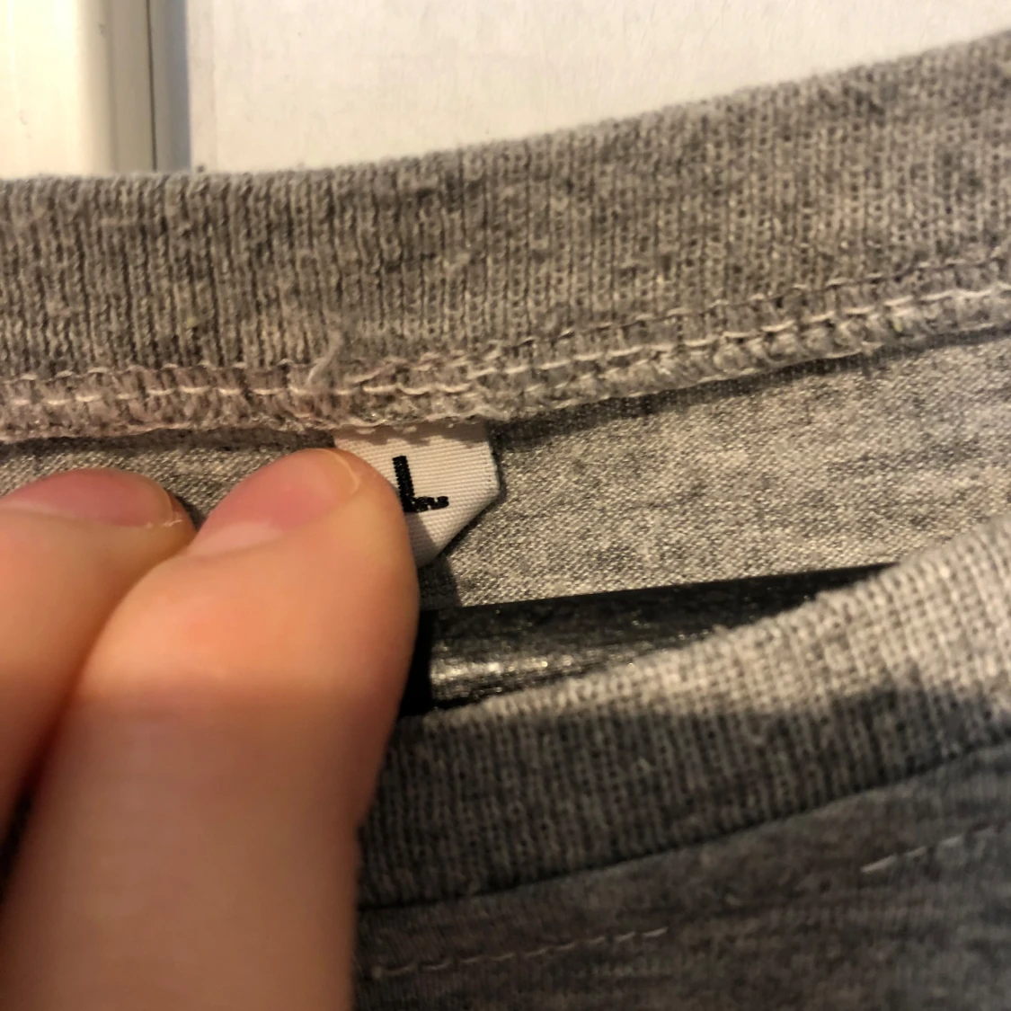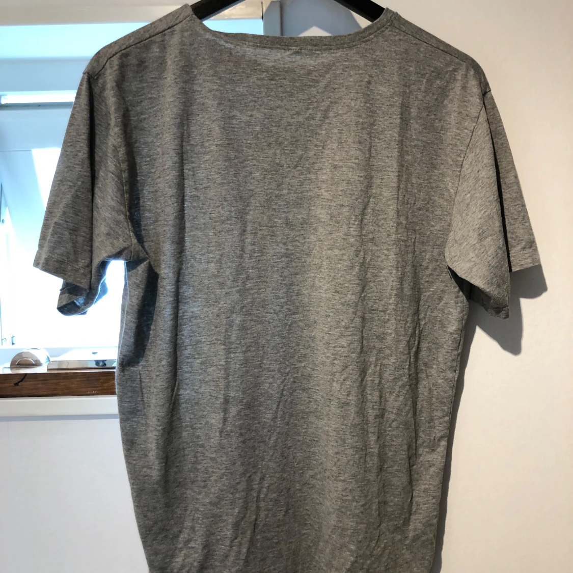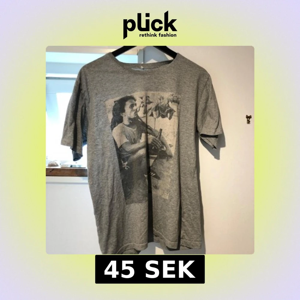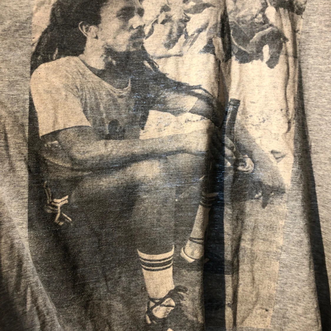 Grå t-shirt i storlek L med ett stort svartvitt fototryck framtill som visar en person sittande med sportiga detaljer. T-shirten har rund halsringning och korta ärmar. Materialet känns mjukt och lätt, perfekt för en avslappnad stil.