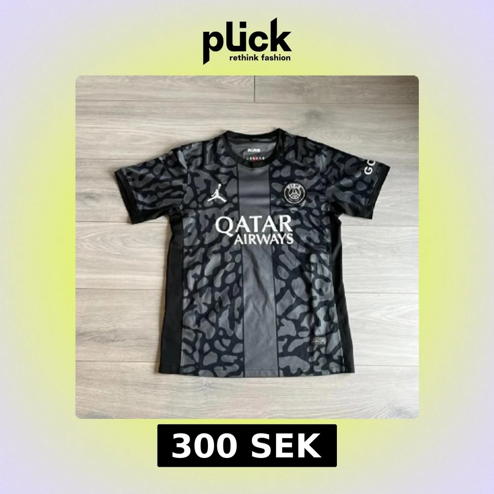 Snygg svart PSG fotbollströja med grått leopardmönster och vita detaljer. Tröjan har korta ärmar, rund hals och är tillverkad i lätt, ventilerande material. Stora loggor från både PSG och Jordan samt Qatar Airways tryck på bröstet.