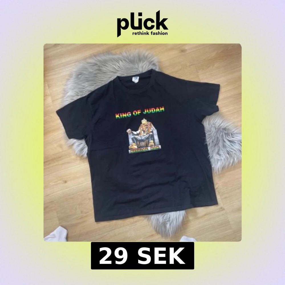 Säljer en svart t-shirt från JHK med färgglatt 'King of Judah'-tryck på framsidan och 'Buen Rollo' på baksidan. Perfekt för en avslappnad stil med en touch av reggae-vibbar. T-shirten är kortärmad och gjord i bomull.