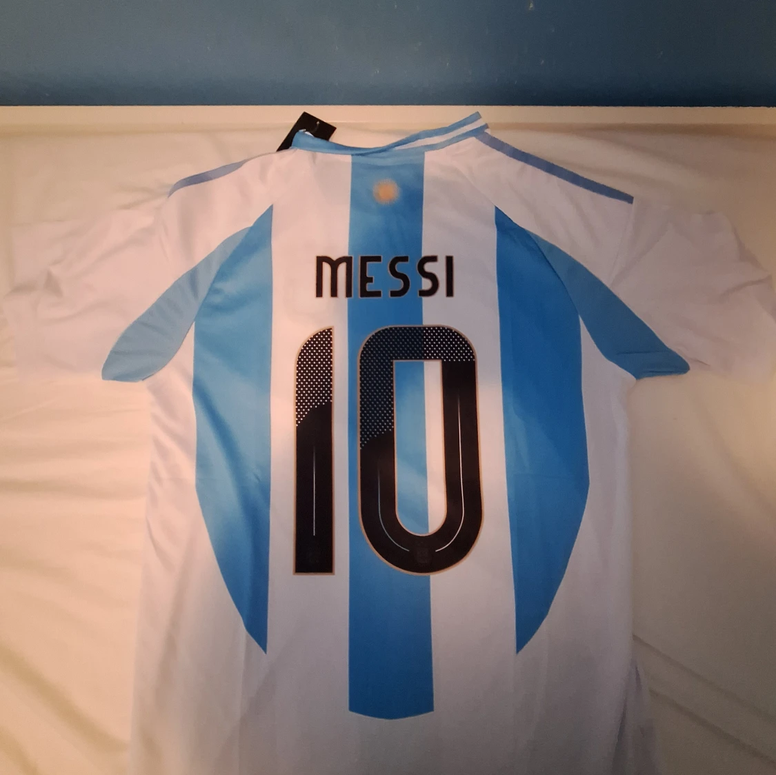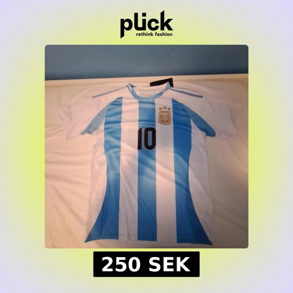 Säljer en klassisk Argentina fotbollströja med Messi och nummer 10 på ryggen. Tröjan har blå och vita vertikala ränder, korta ärmar och AFA-emblemet med tre stjärnor på bröstet. Tillverkad i lätt polyester, perfekt för match eller träning.