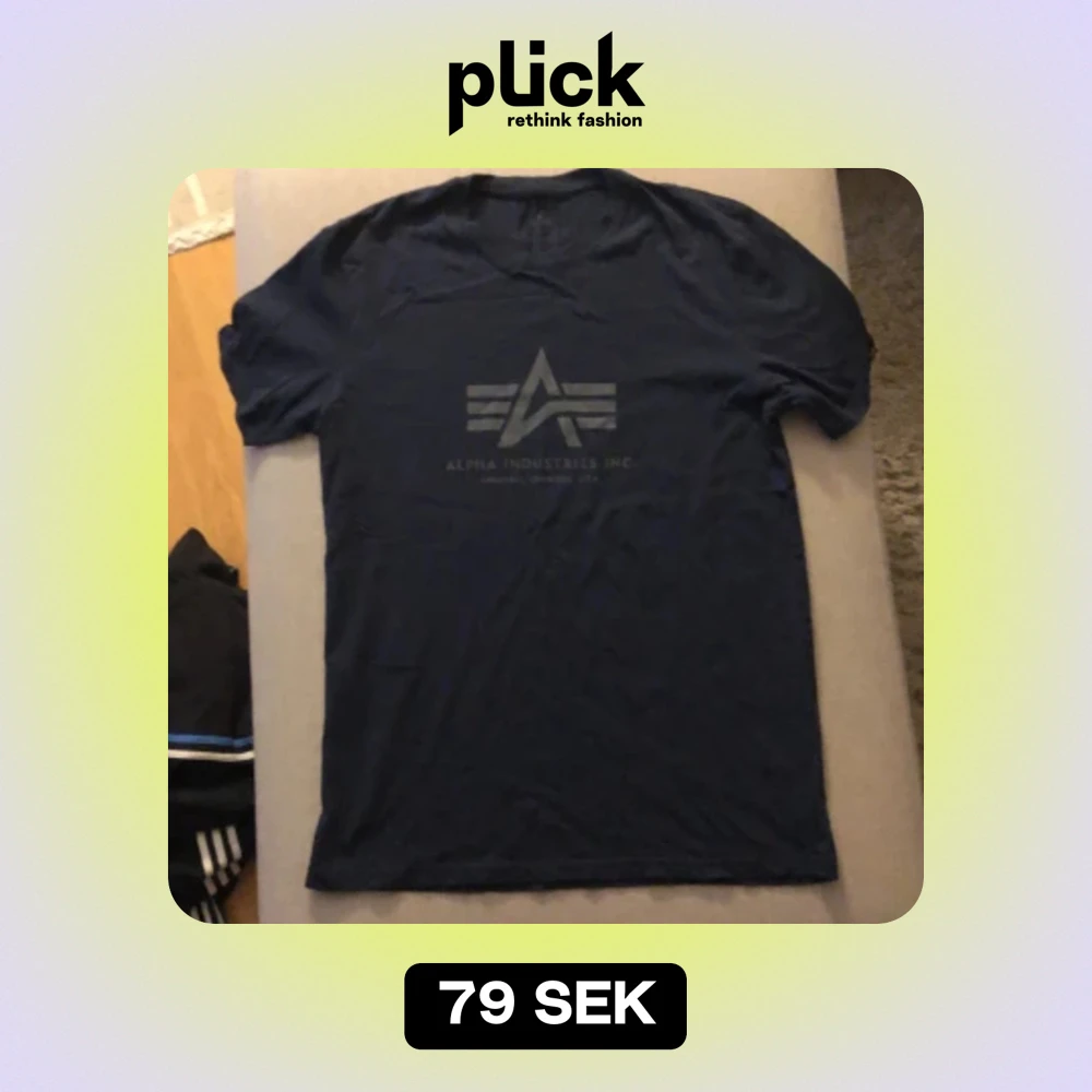 En mörkblå t-shirt från Alpha Industries med deras logotyp tryckt på framsidan. T-shirten har korta ärmar och en rund halsringning.