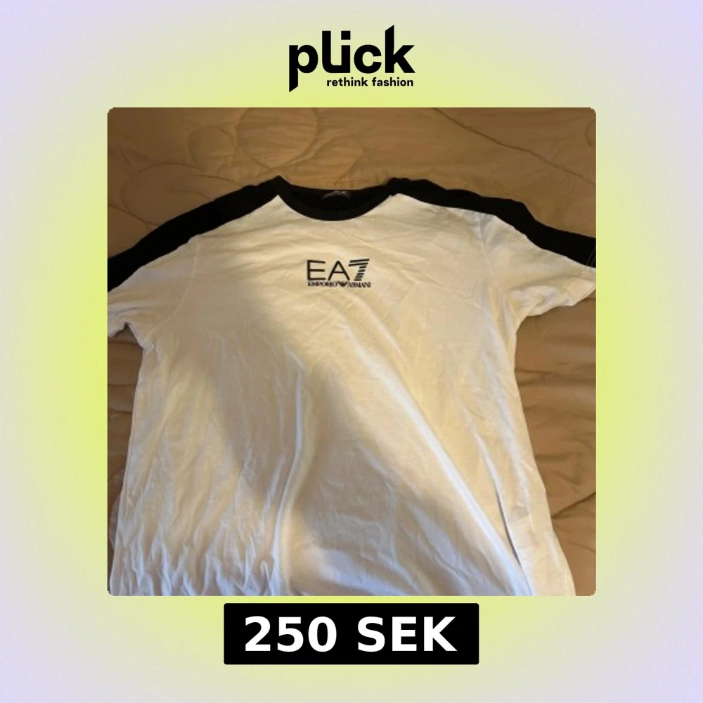 Snygg vit t-shirt från EA7 Emporio Armani med svarta detaljer på axlar och krage. Klassisk rund hals och korta ärmar. T-shirten har tryckt logga på bröstet och är gjord i mjuk bomull som känns skön mot huden. Perfekt för dig som gillar stilrena märkesplagg.