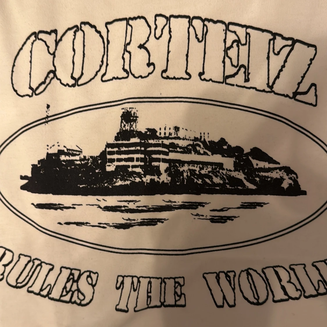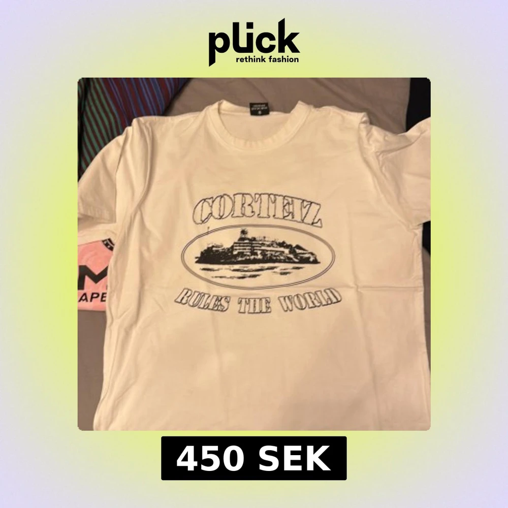 Säljer en vit t-shirt från Cortez med ett stort svart tryck på framsidan som säger 'Cortez Rules The World'. T-shirten har en klassisk rund hals och korta ärmar. Perfekt för en avslappnad stil.