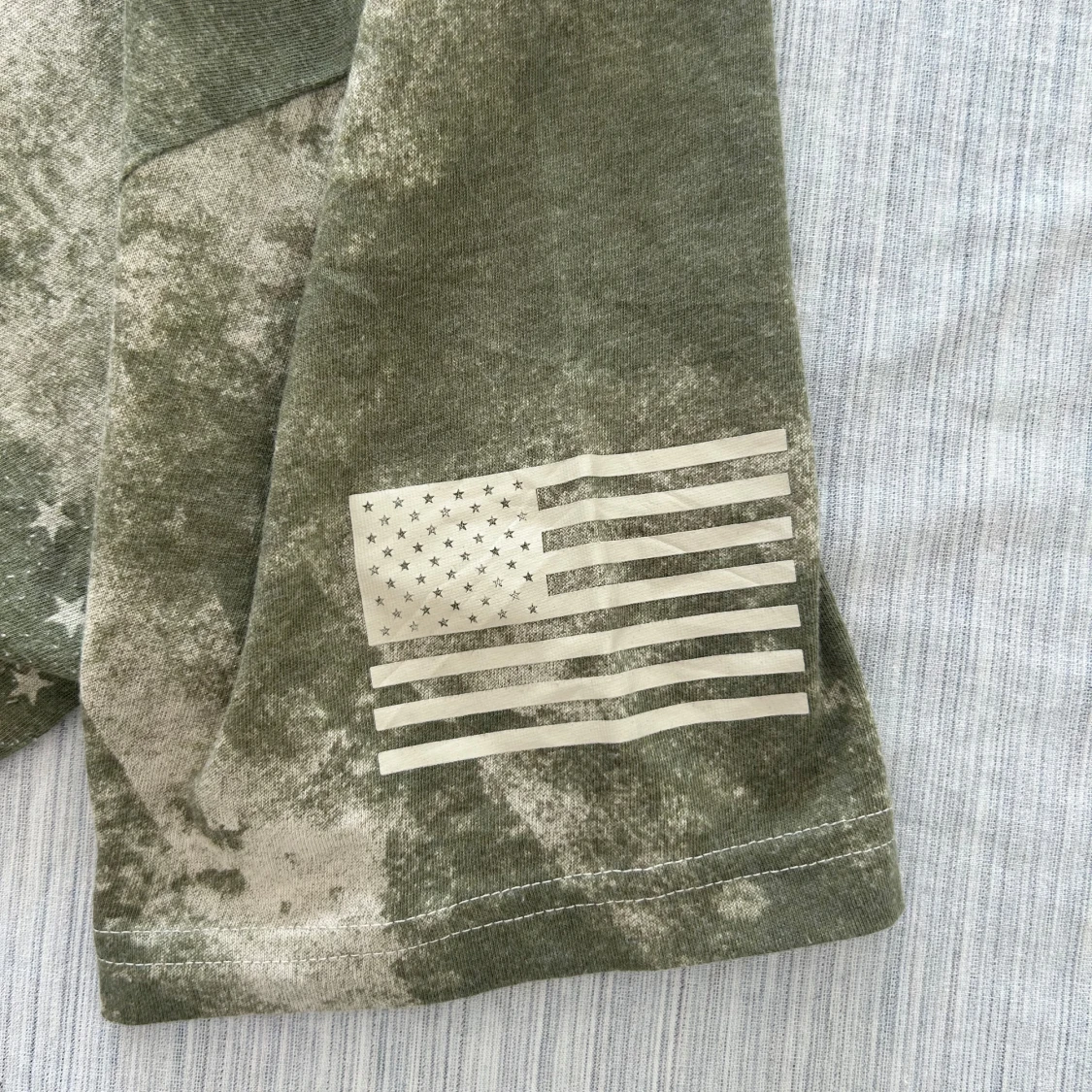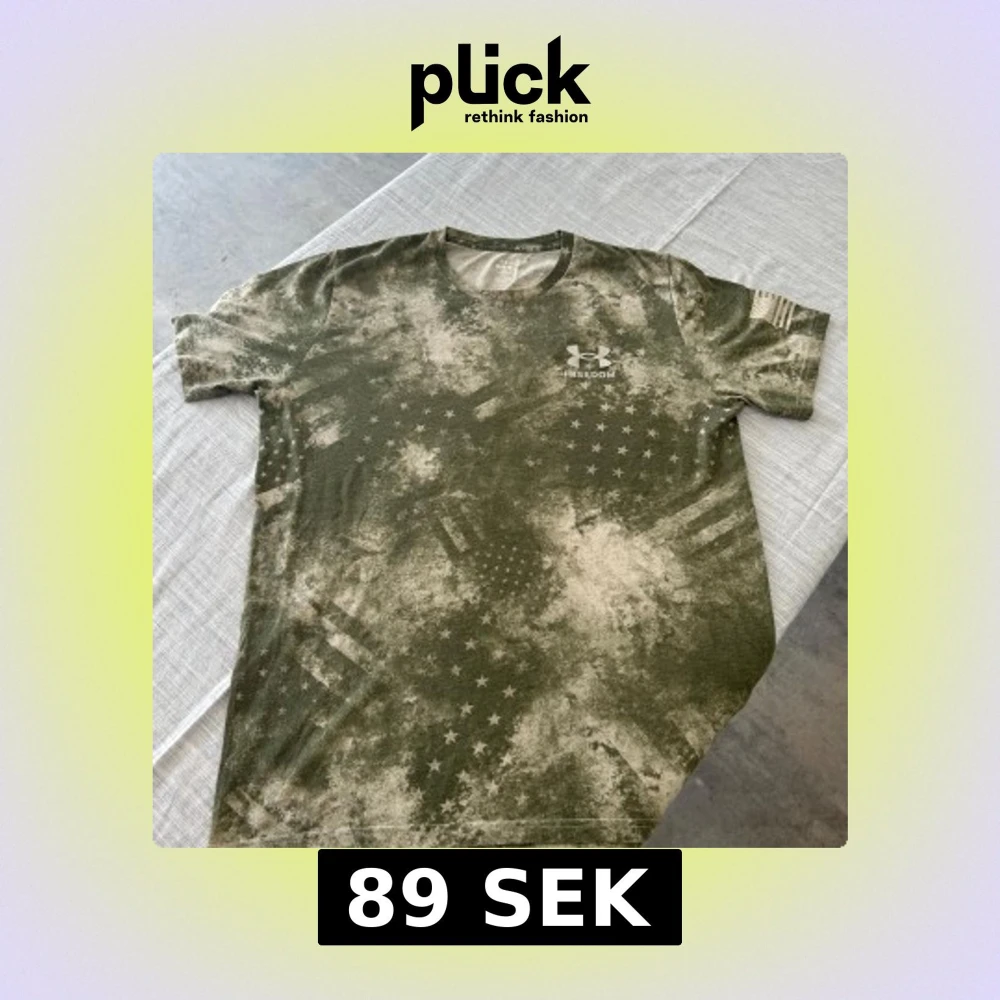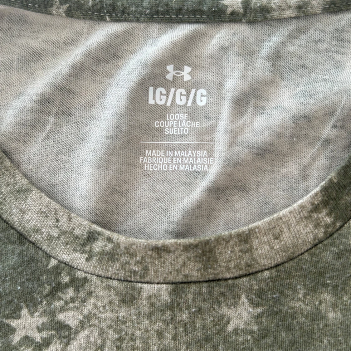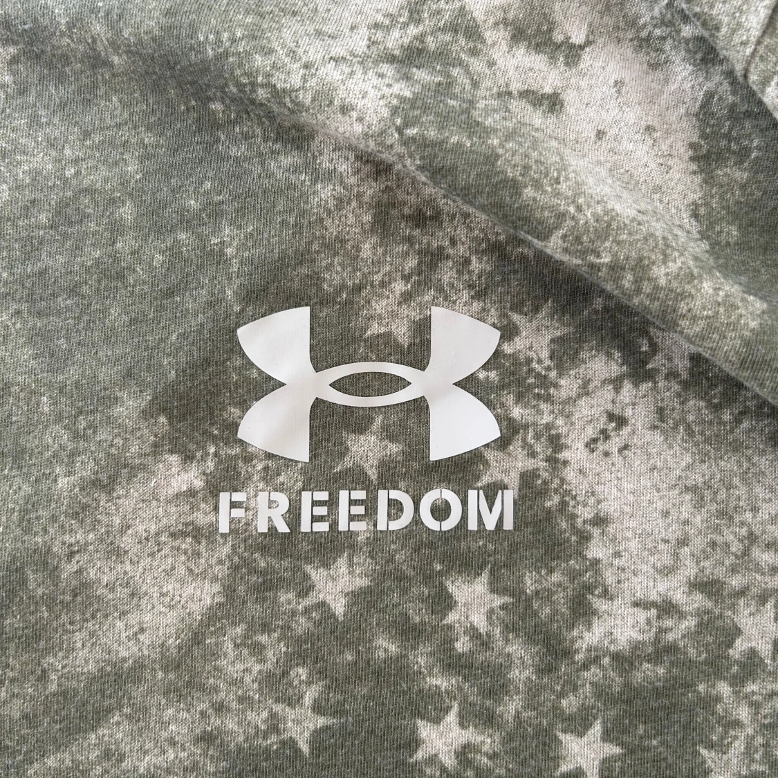 Snygg grön t-shirt från Under Armour Freedom-kollektionen med camouflagemönster och stjärnor. Tryckt amerikansk flagga på ärmen och stort Under Armour-logo på bröstet. Modellen är loose fit och har korta ärmar. Perfekt för dig som gillar streetwear och sportig stil.