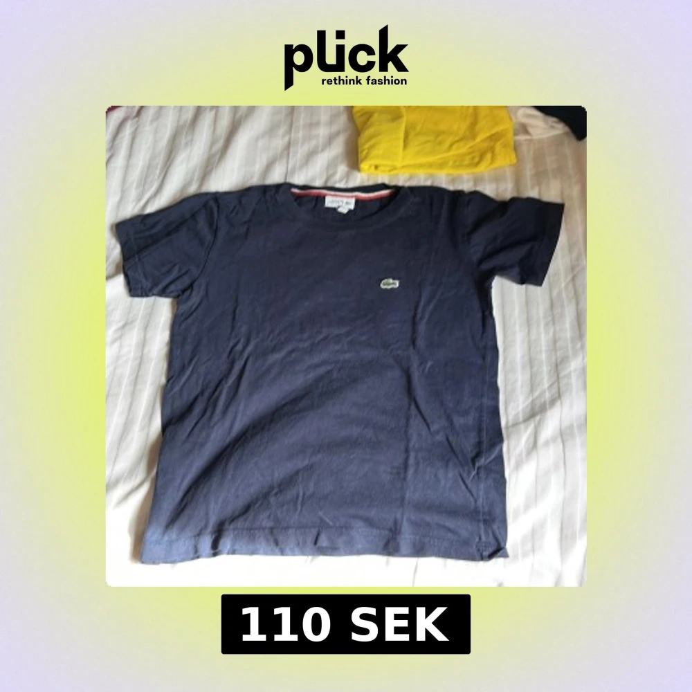 Säljer en mörkblå t-shirt från Lacoste med klassisk krokodillogga på bröstet. T-shirten har rund halsringning med röd och vit detalj på insidan av kragen och är kortärmad. Perfekt för en stilren och sportig look.