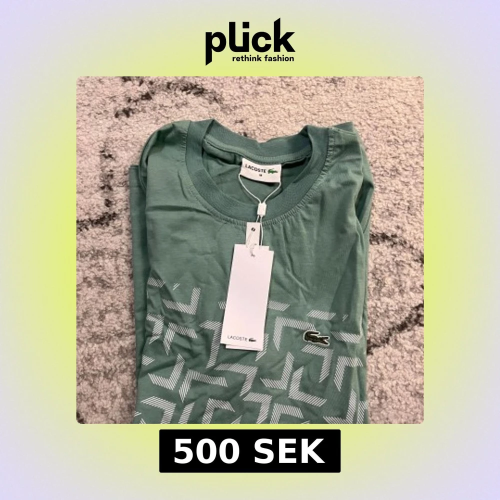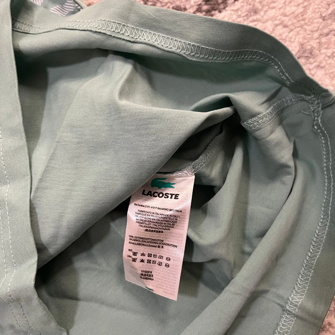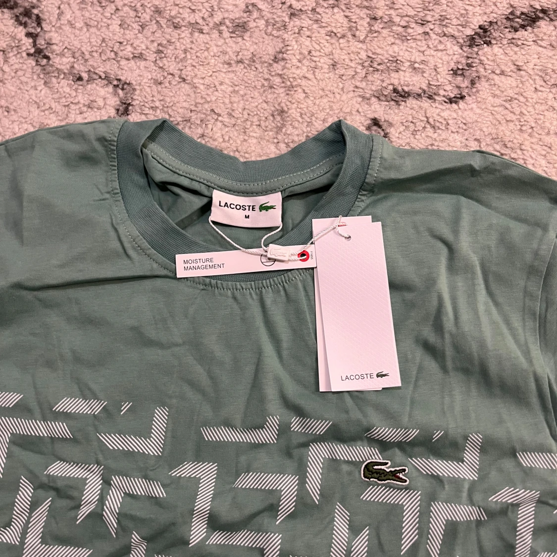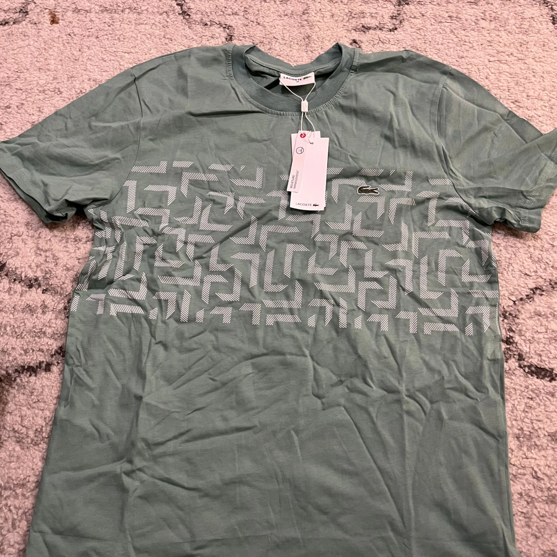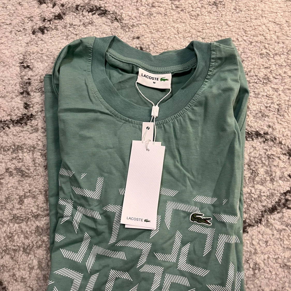 Snygg grön t-shirt från Lacoste med ett unikt geometriskt mönster i vitt. T-shirten har en klassisk rund hals och korta ärmar. Perfekt för en stilren och avslappnad look.