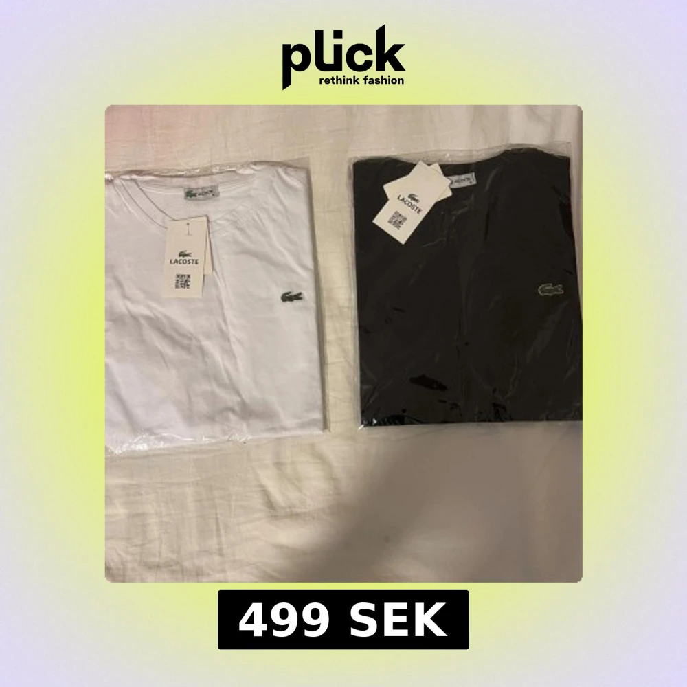 Två klassiska t-shirts från Lacoste, en vit och en svart, båda med den ikoniska krokodilloggan broderad på bröstet. T-shirtsen har rund hals och korta ärmar. Perfekt basplagg för garderoben.