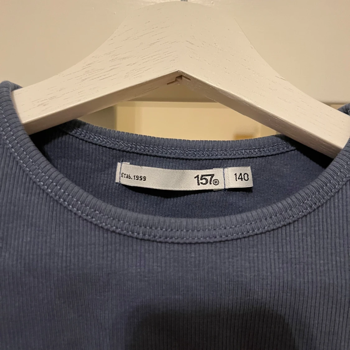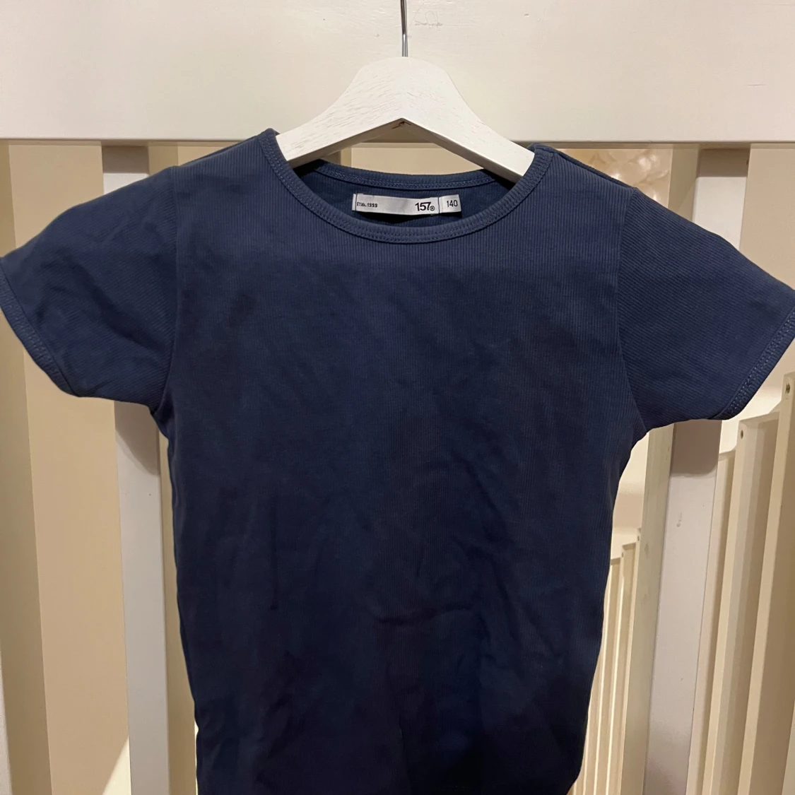 Säljer en stilren mörkblå ribbad t-shirt från Lager 157. Den har en klassisk rund hals och korta ärmar, perfekt för en avslappnad look. Passar bra till både jeans och shorts.