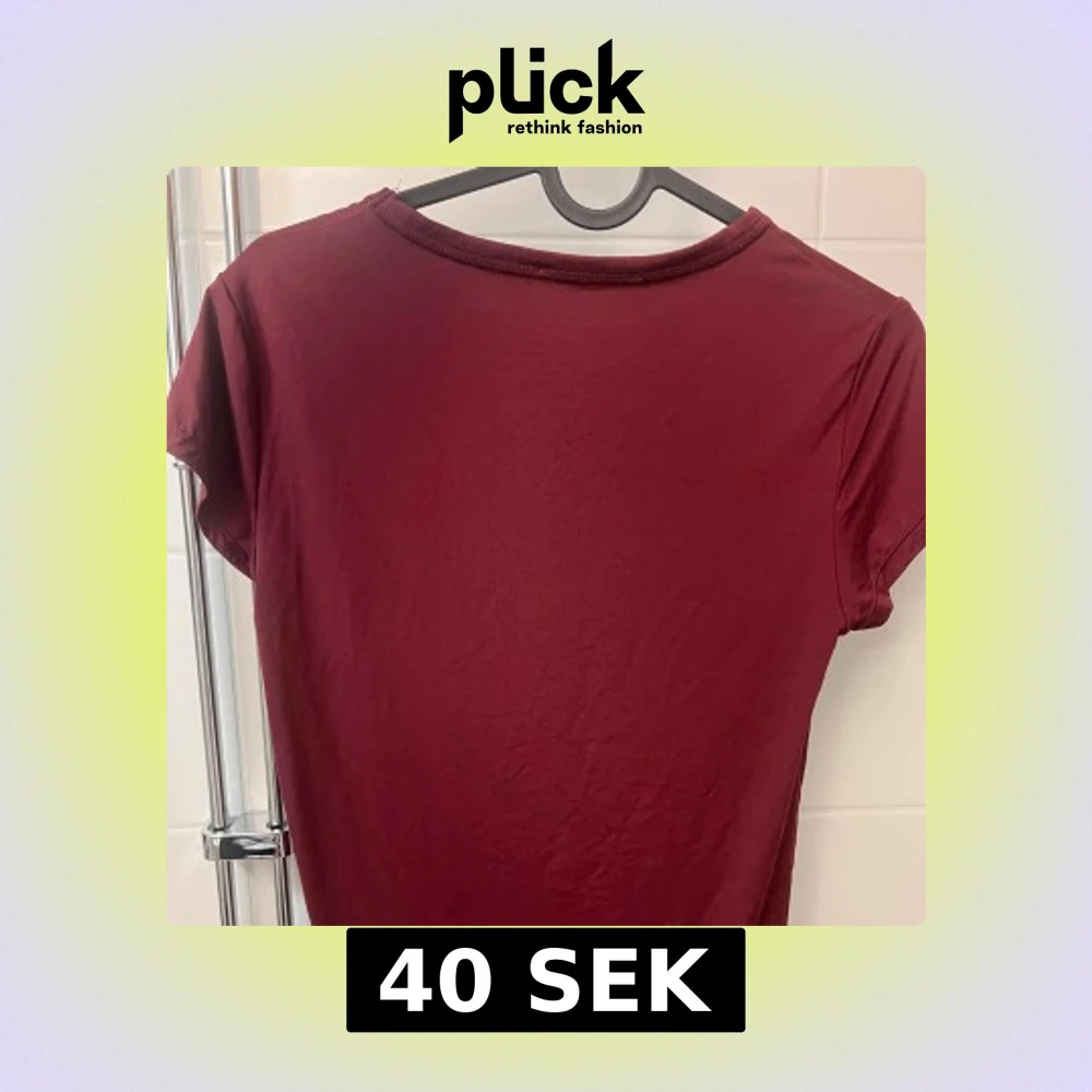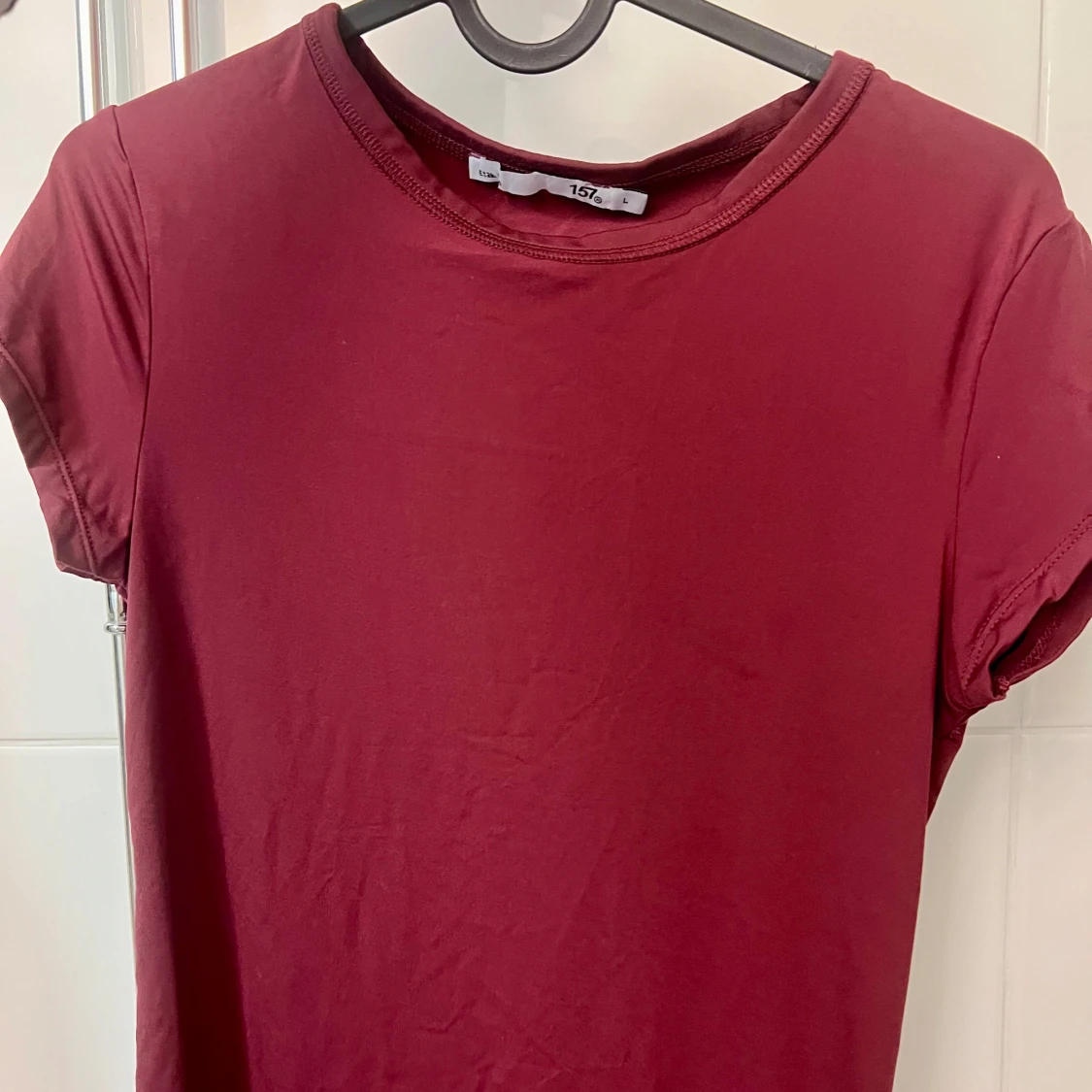 Säljer en enkel och stilren vinröd t-shirt med korta ärmar. Perfekt för en avslappnad look. T-shirten har en rund halsringning och är gjord i ett mjukt material.