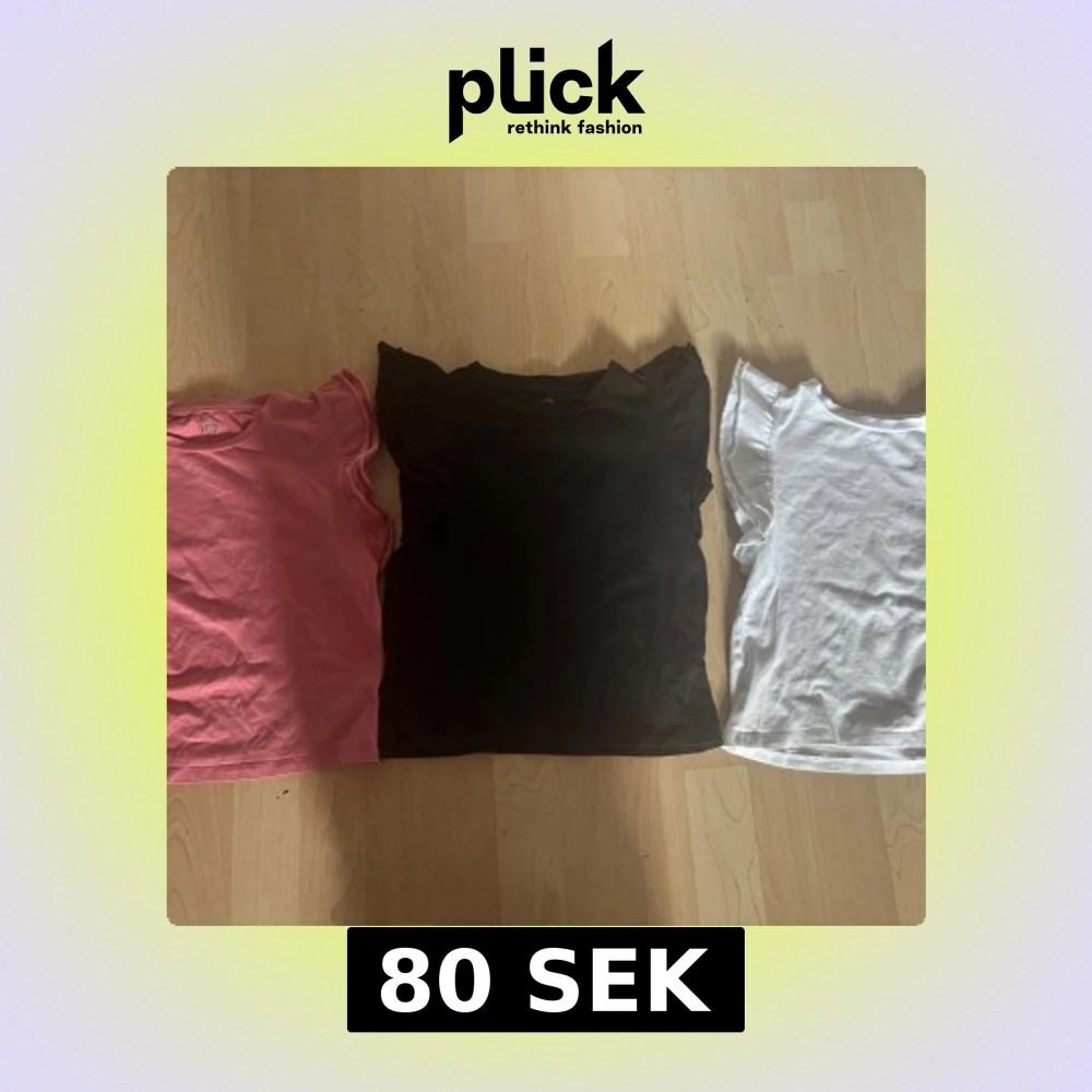 Säljer tre snygga t-shirts från 157 i storlek S. En svart, en vit och en rosa, alla med volangdetalj vid ärmarna. Tillverkade i mjuk bomull med lite stretch för extra komfort. Perfekta för dig som gillar en enkel men söt stil. 3 tröjor från 80 kr❤️