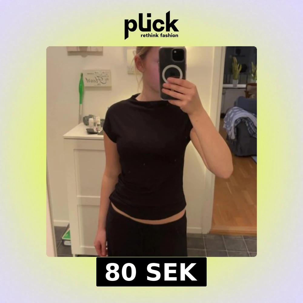 En enkel svart t-shirt med korta ärmar och rund hals. Modellen är figurnära och passar perfekt till jeans eller mjukisbyxor. T-shirten har en klassisk look och är lätt att matcha med andra plagg.