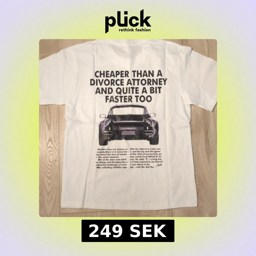 Vit t-shirt med stort tryck på ryggen föreställande en Porsche och texten “Cheaper than a divorce attorney and quite a bit faster too”. Tillverkad i 100% mjuk bomull med klassisk passform och rund halsringning. 📏Storlek S längd: 65cm. Bredd: 46cm. Oanvänd i fint skick. Meddela vid frågor!