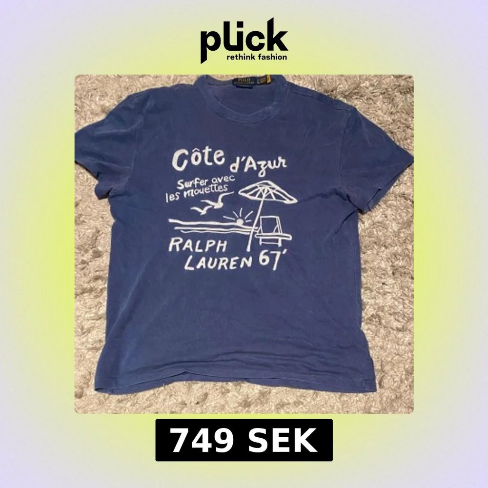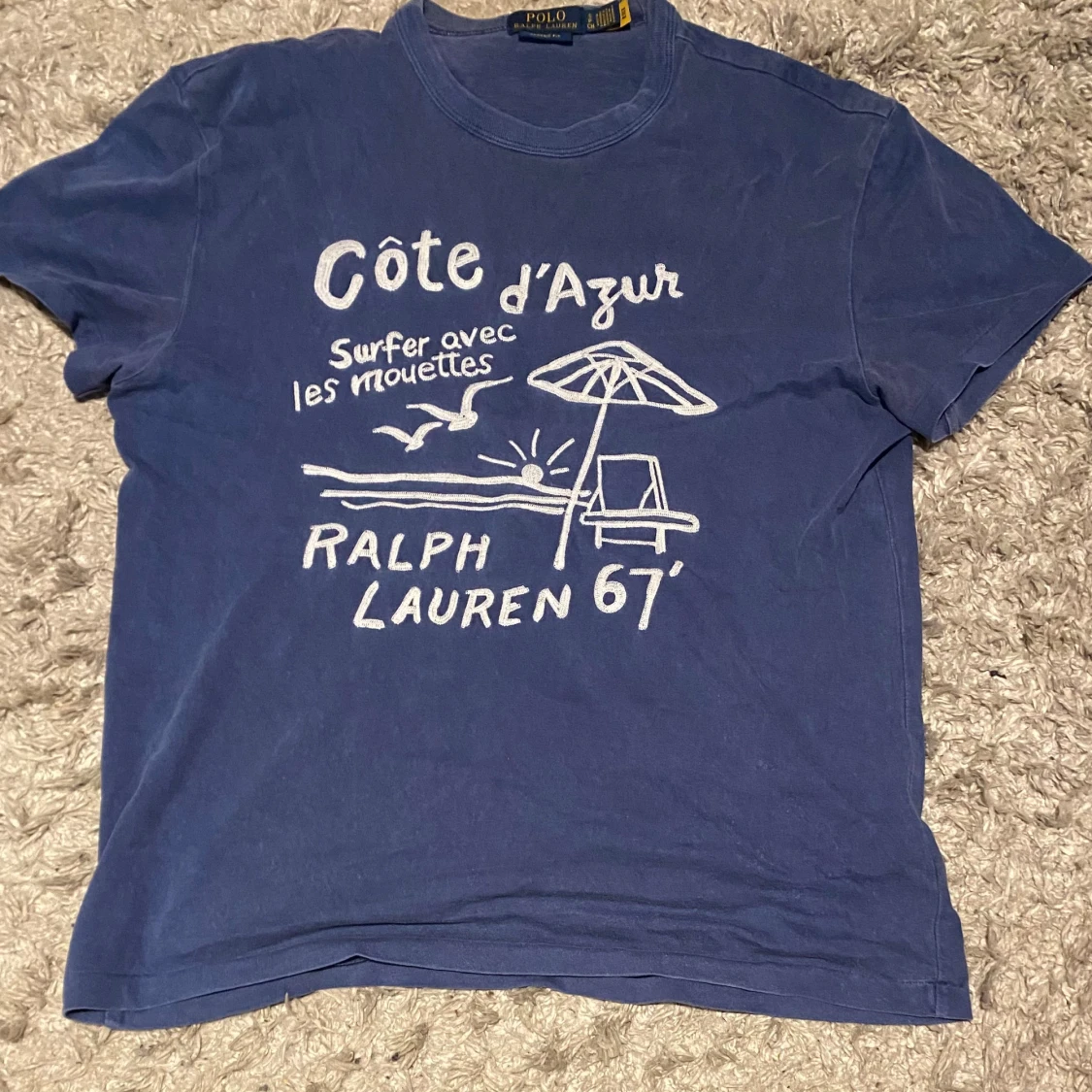 Blå t-shirt från Polo Ralph Lauren med vit Côte d'Azur-print och strandmotiv framtill. Klassisk rund halsringning och korta ärmar. Skön bomullskvalitet och relaxed vibe, perfekt för sommardagar. Otroligt bra skick, nypris ligger på runt 2000! Hör av er om ni har några frågor!