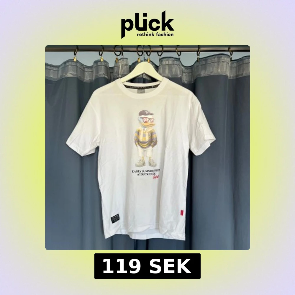 Vit t-shirt från B-One-Soul med coolt tryck av en anka i streetwear-stil och texten 'EARLY SUMMER PREP of DUCK DUDE'. Klassisk passform, rund hals och korta ärmar. Perfekt för dig som gillar unika prints och avslappnad stil. Street version av Ralph Lauren teddybjörnen (; köpt i Japan