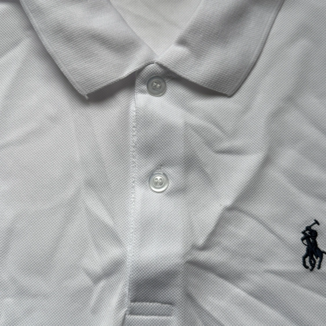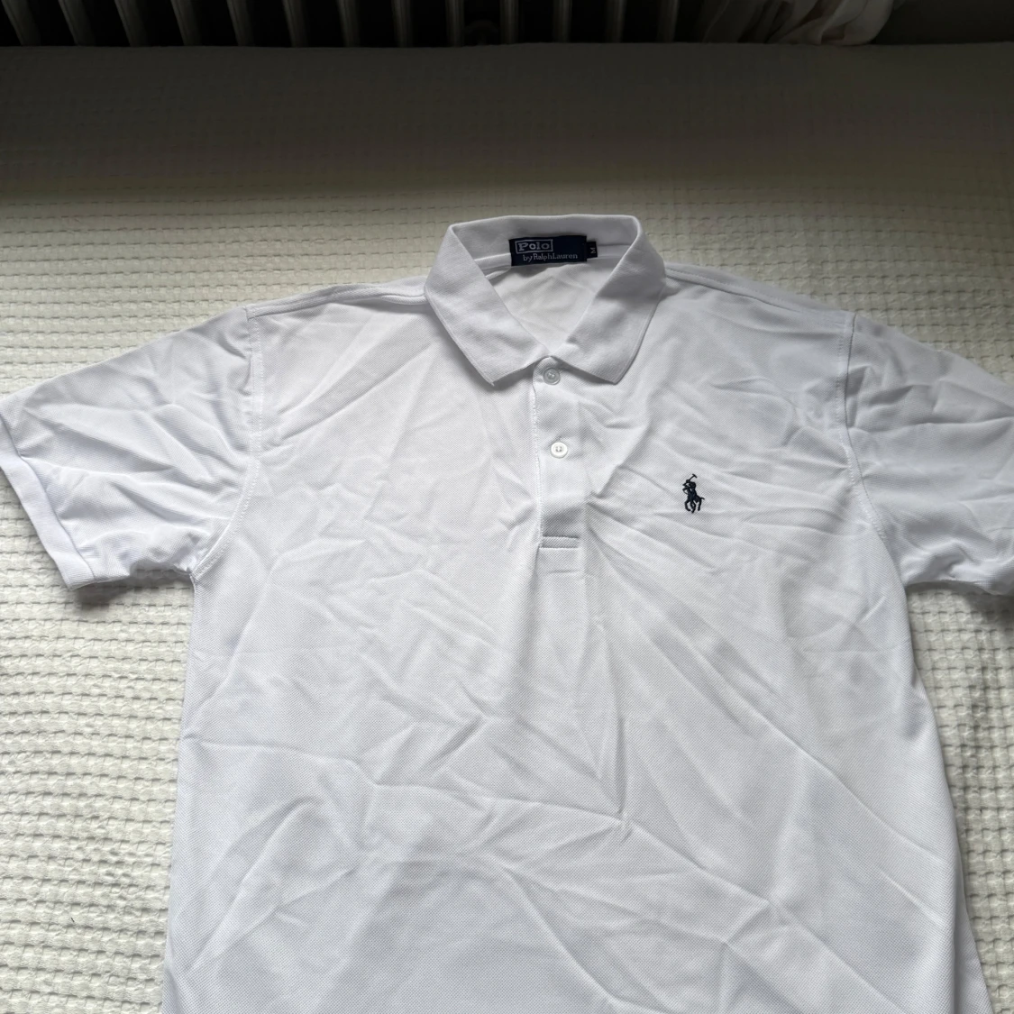 Fräsch vit polo t-shirt från Ralph Lauren med klassisk krage och två knappar framtill. Ikoniska broderade loggan i marinblått på bröstet. T-shirten är kortärmad och tillverkad i mjuk bomull som andas. Perfekt för en clean och stilren look.