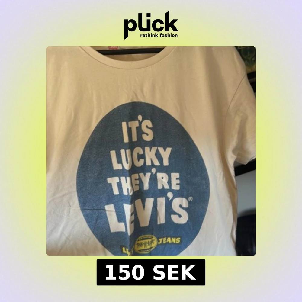 Säljer en vit t-shirt från Levi's med ett stort blått och gult tryck på framsidan som säger 'It's Lucky They're Levi's'. Perfekt för en avslappnad stil. Standard passform och kortärmad.
