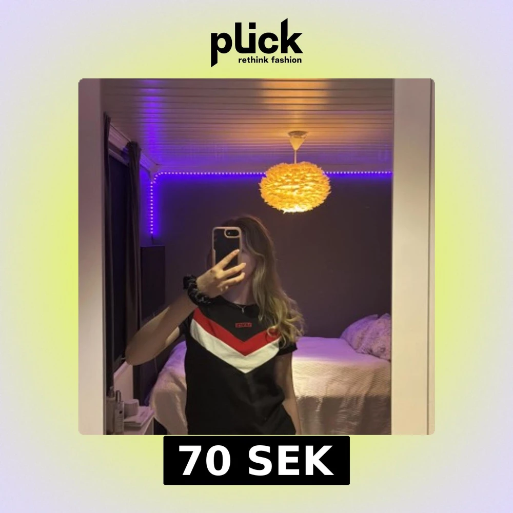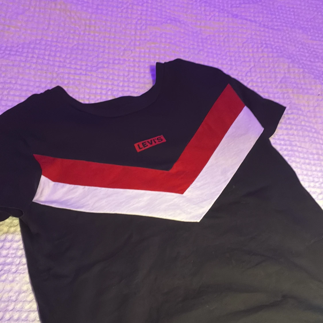 Svart Levis tshirt med röda och vita ränder under loggan, jätte fin och skön men kommer tyvärr inte till användning längre! Storlek xxs men passar mig som annars har xs!