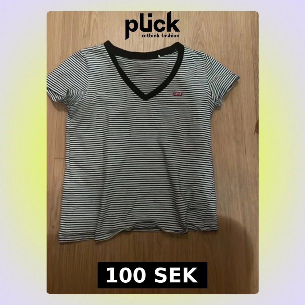 Snygg t-shirt från Levi's med svartvita ränder och v-ringning med svart kant. Klassisk passform och liten röd Levi's-logga på bröstet. Perfekt till jeans eller shorts