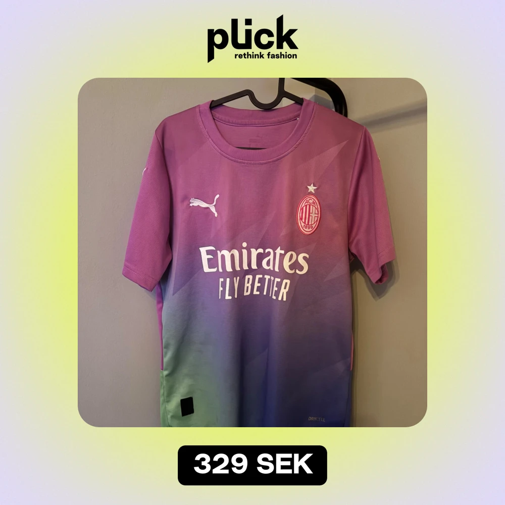 Säljer en snygg AC Milan fotbollströja i lila och grön från Puma. Tröjan har korta ärmar och är i mycket bra skick. Den har ett coolt färgskiftande mönster och klubbens emblem på bröstet. Perfekt för alla Milan-fans! 💜💚 självklart äkta nypris 1199 mitt pris 329 pris kan diskuteras