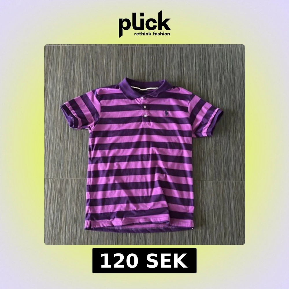 Säljer en klassisk pikétröja från Polo Ralph Lauren i lila och mörklila ränder. Tröjan har krage, knappar framtill och korta ärmar. Perfekt för en sportig och stilren look.