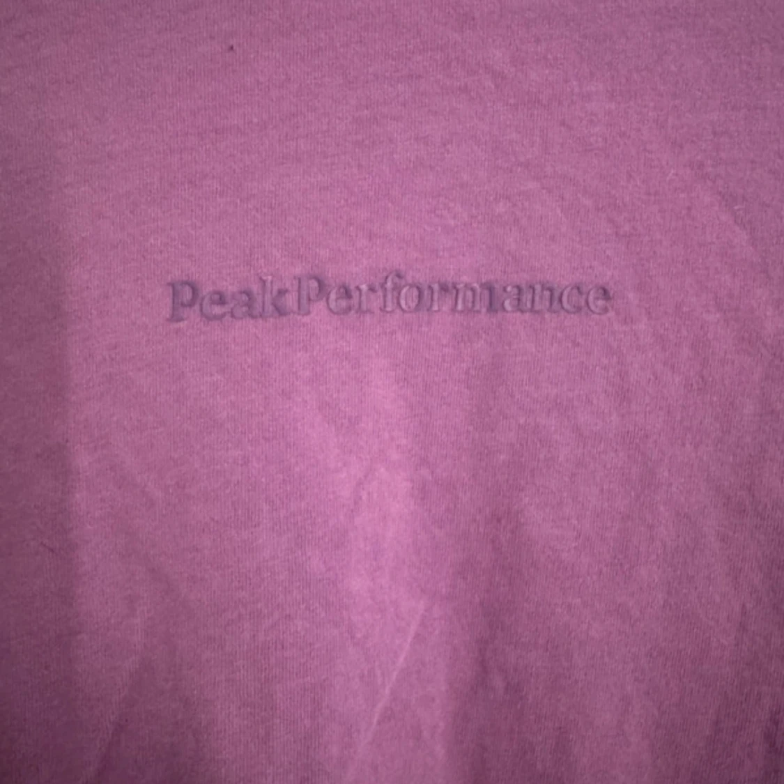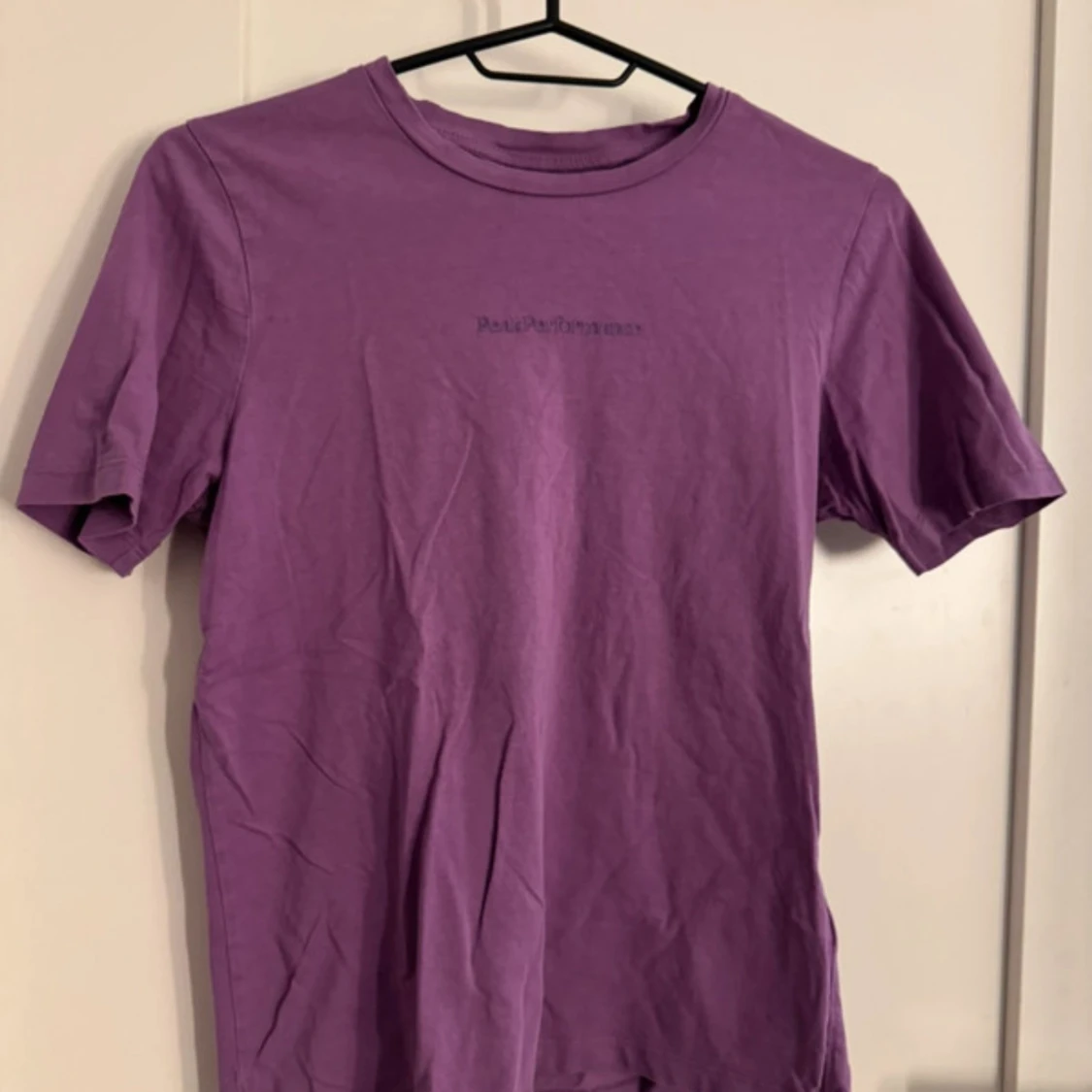 Säljer en lila t-shirt från Peak Performance med diskret logga framtill. T-shirten har rund halsringning och är tillverkad i mjuk bomull. Perfekt för en avslappnad stil.