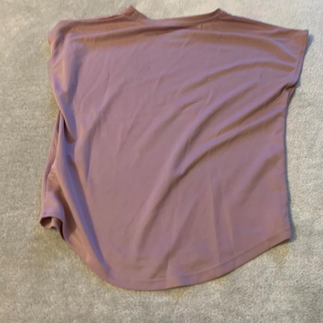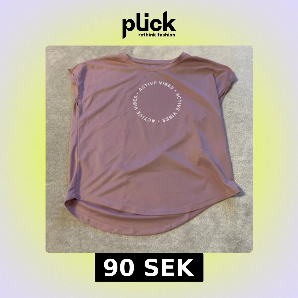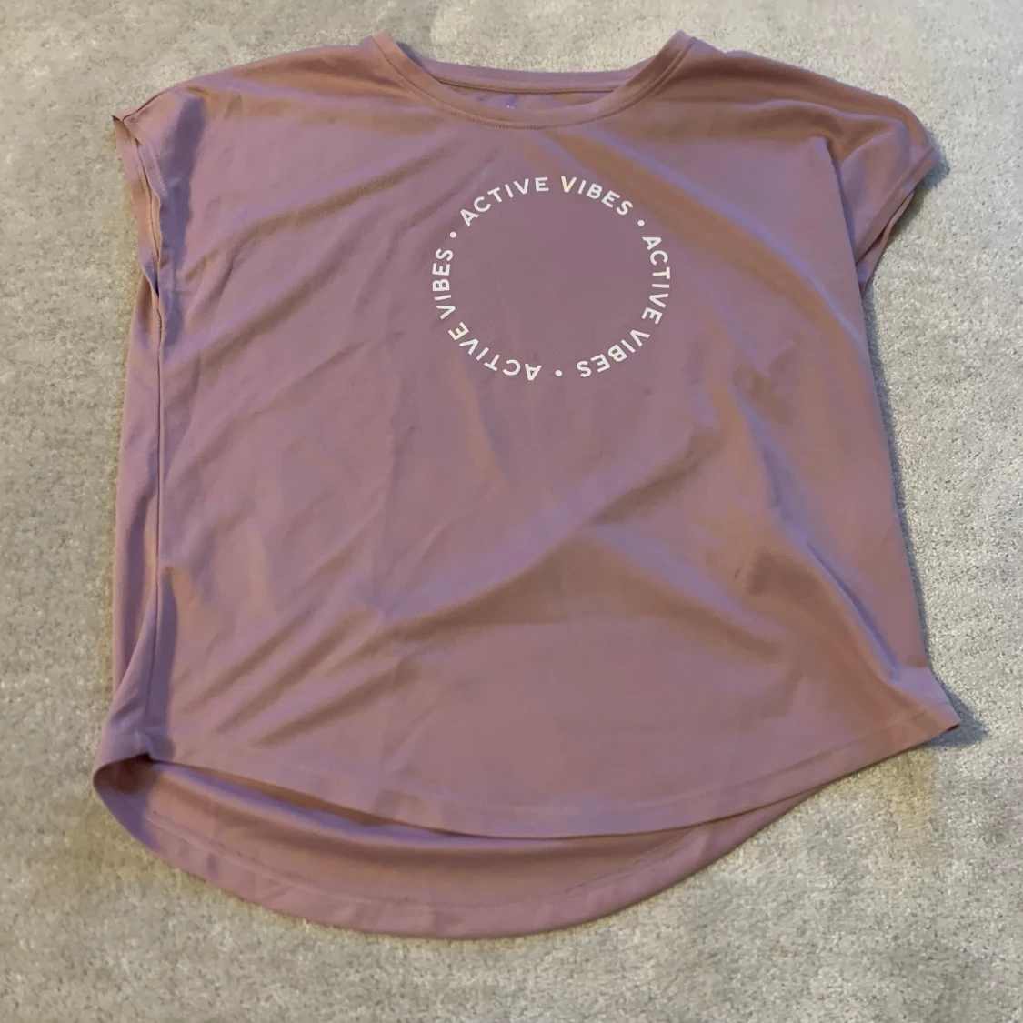 Säljer en lila t-shirt med texten 'Active Vibes' tryckt i en cirkel på framsidan. T-shirten har en avslappnad passform och korta ärmar. Perfekt för en aktiv livsstil!