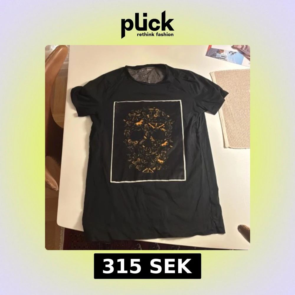Svart t-shirt från Limitato med korta ärmar och ett stort tryck framtill som föreställer en döskalle gjord av fjärilar i orange och gult. Skön passform och tillverkad i mjuk bomull. Tshirten är i bra skick 8/10 och har inga defekter. Riktigt snygg och fräsch tröja.Storlek Xs men passar även folk som har storlek S