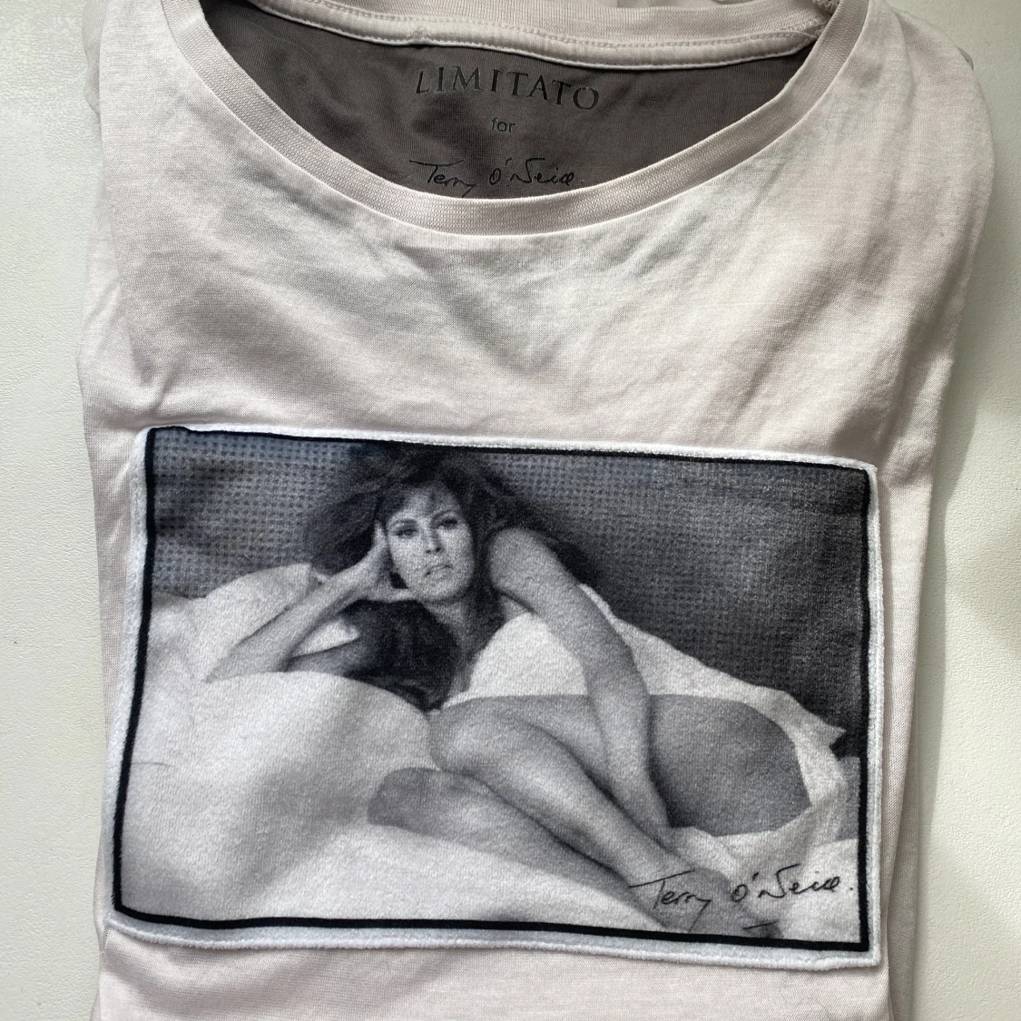 En ljusrosa Limitato t-shirt där trycket är i sammet. Den är en Xs för män så skulle säga ett den sitter som en S för damer. Väldigt tunnt och skönt material