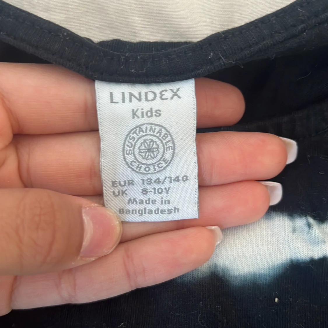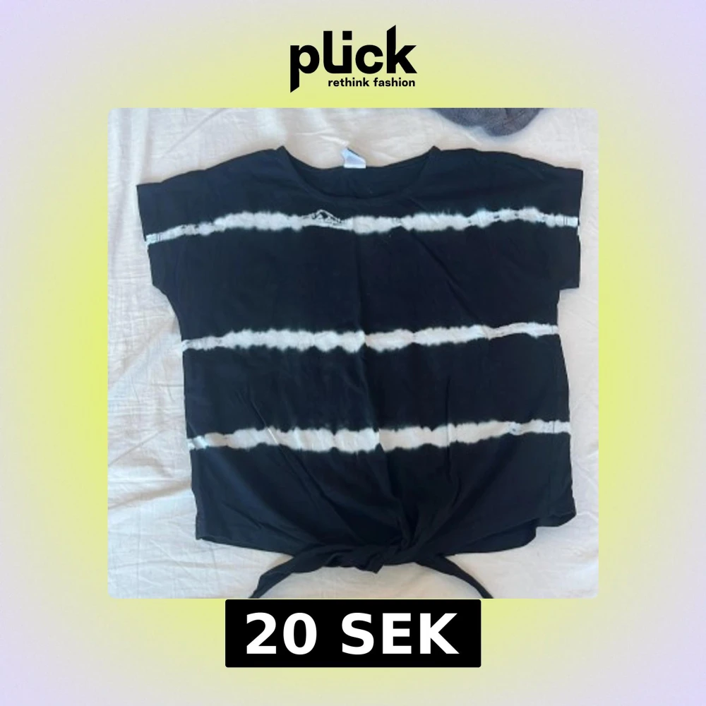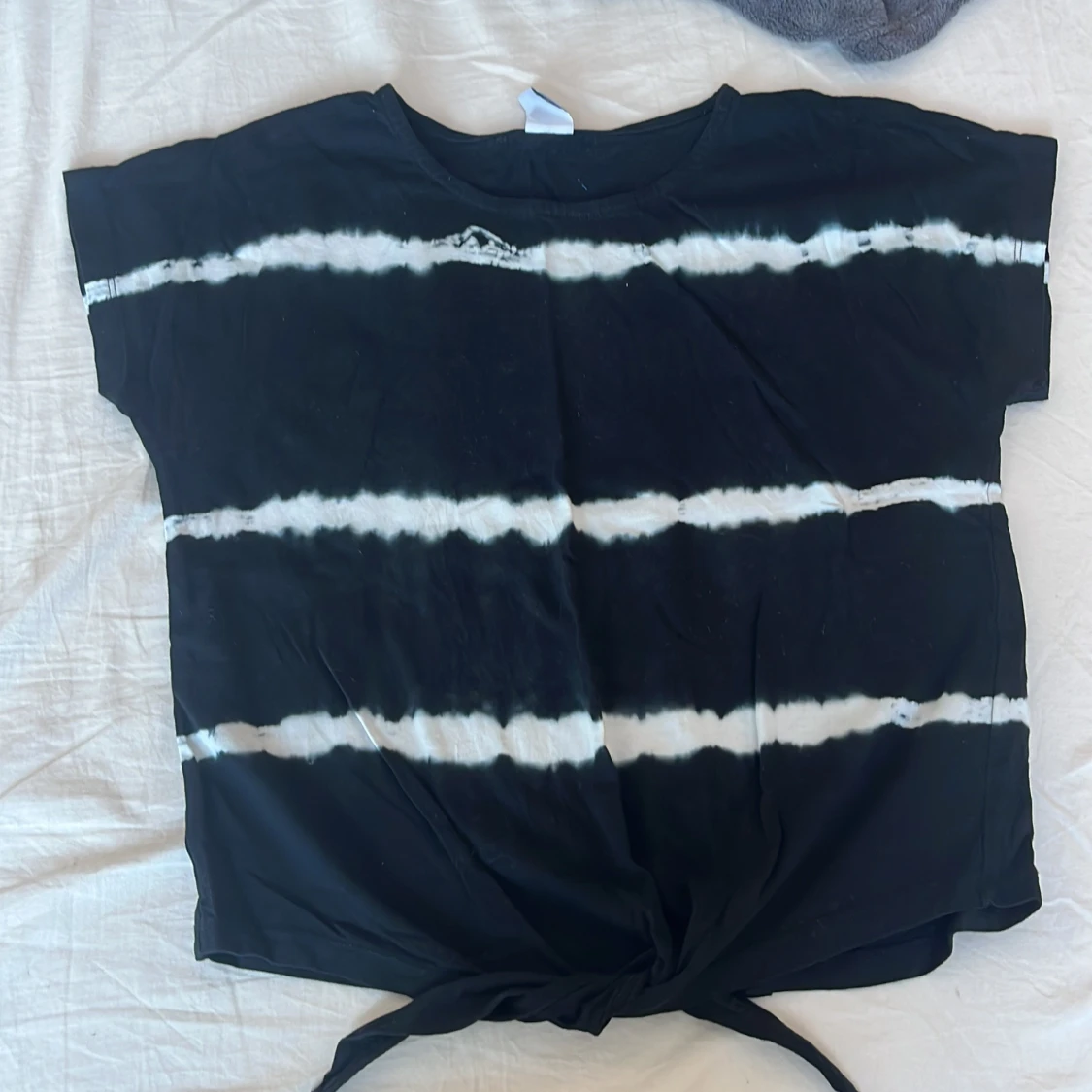 Säljer en cool svart t-shirt från Lindex med vita ränder i tie-dye stil. T-shirten har korta ärmar och en knytning framtill som ger en avslappnad look. Perfekt för en trendig vardagsstil!